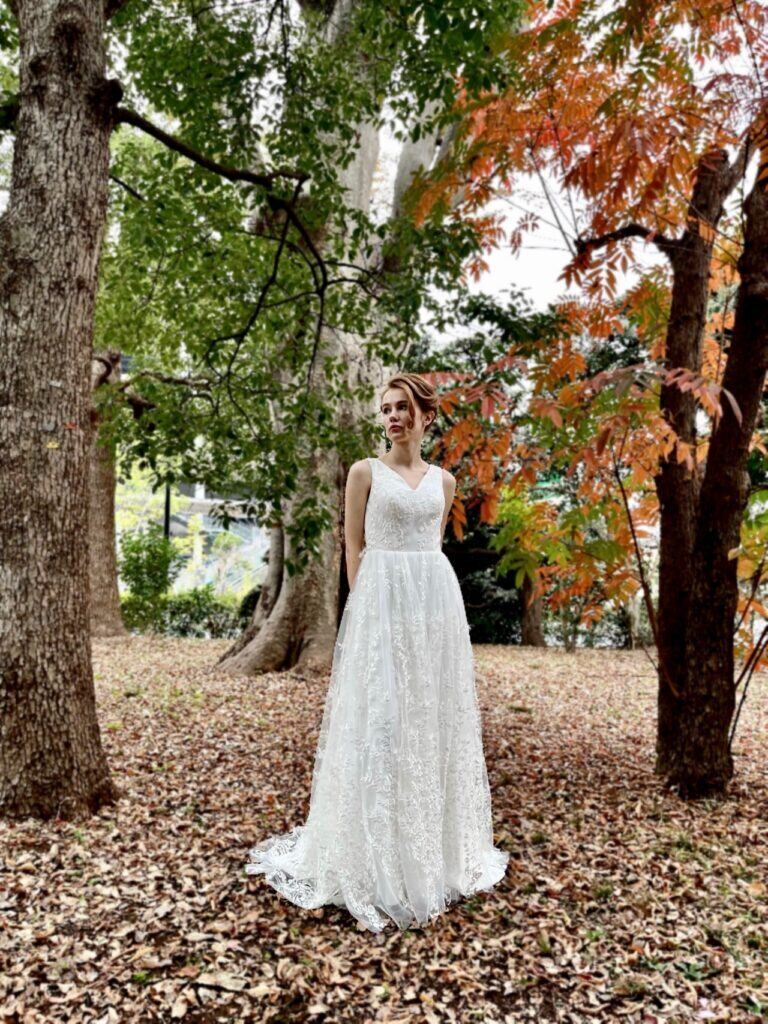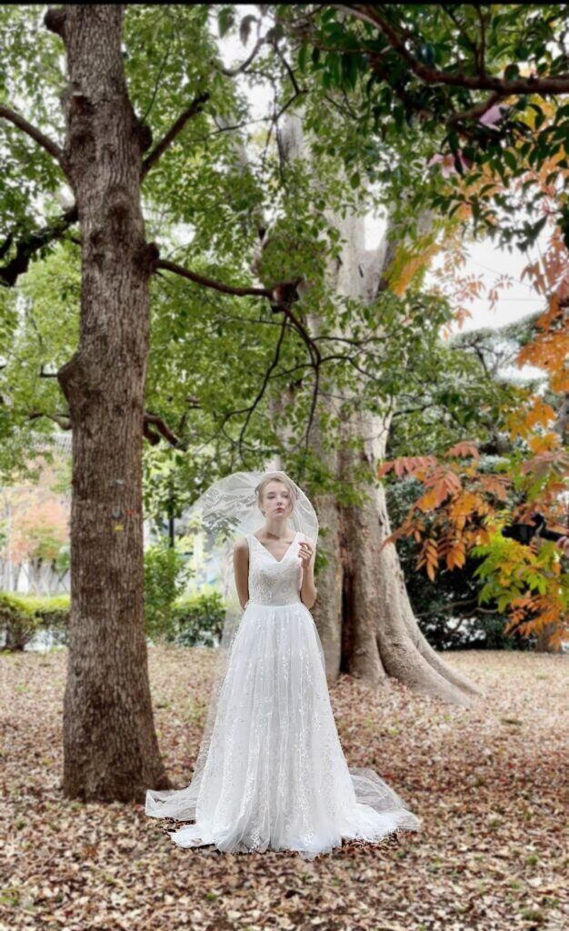 上品! 豪華! 純白 ウエディングドレス Vネックドレス ロングベール 贅沢な小花総レース プリ /結婚式/披露宴/