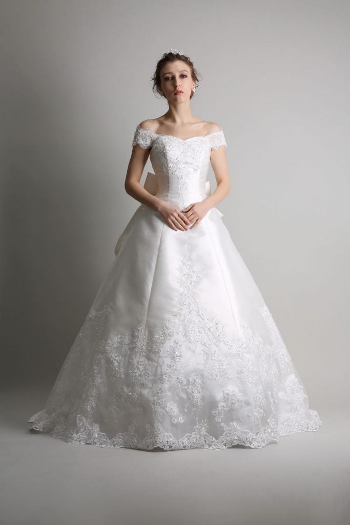 高品質!豪華! オフホワイト ウエディングドレス オフショルダー 贅沢な総レース リボン 華やかなトレーン プリンセスライン 結婚式/披露宴/