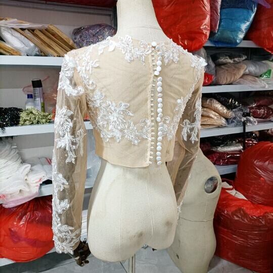 素肌見せるボレロ クルーネック 3D立体レース刺繍 くるみボタン トップス