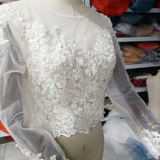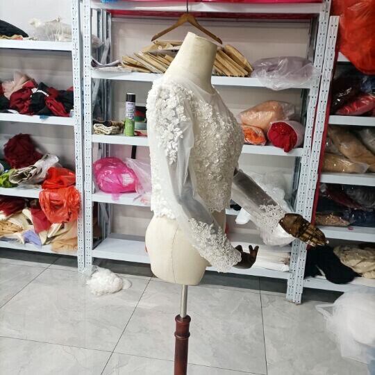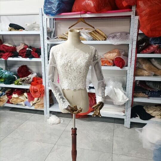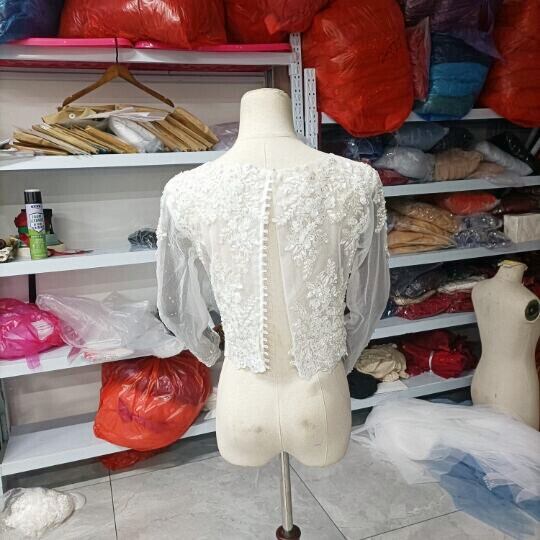 ボレロ トップス ビジュー刺繍 パール 3D立体レース刺繍 くるみボタン 上品透け袖 長袖