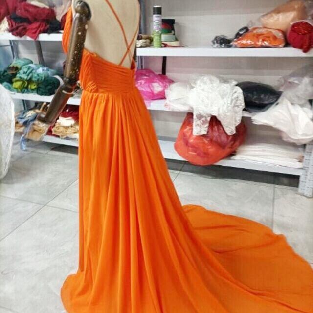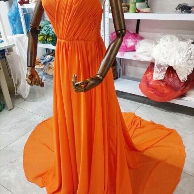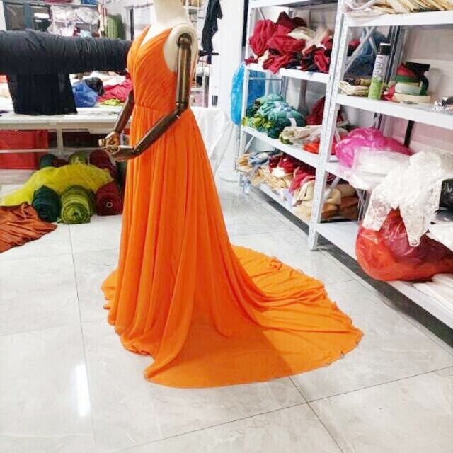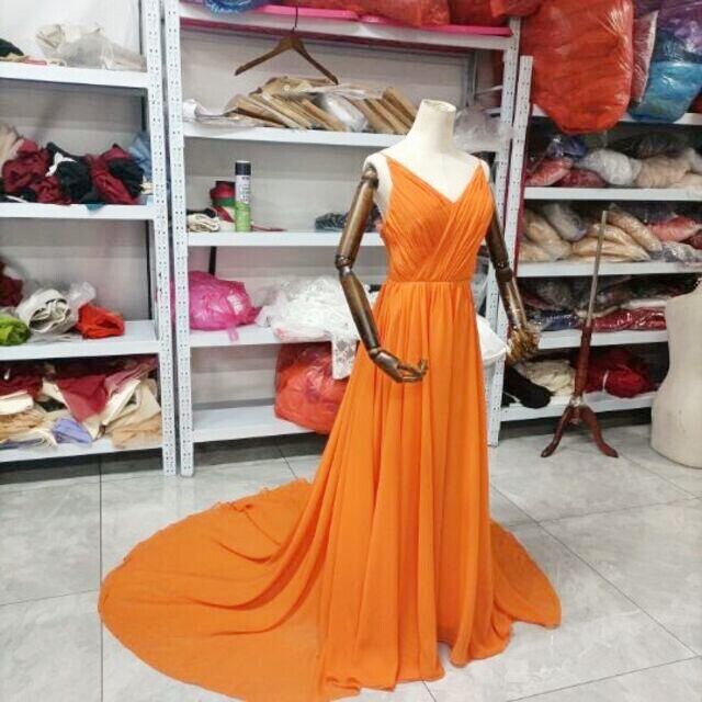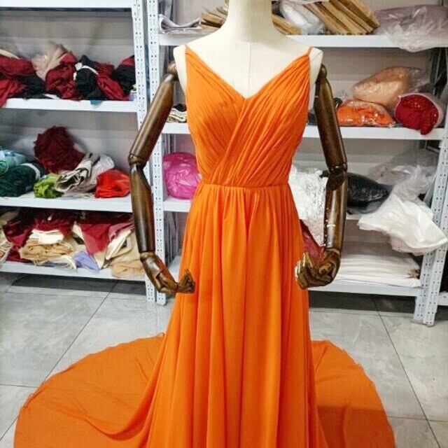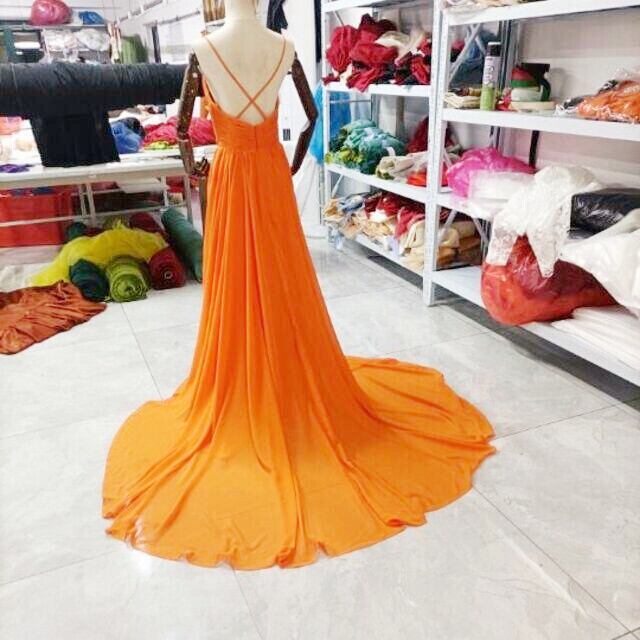 ふんわりシフォン製 オレンジカラードレス Vネックドレス キャミソール 結婚式/披露宴 豪華なトレーン