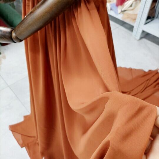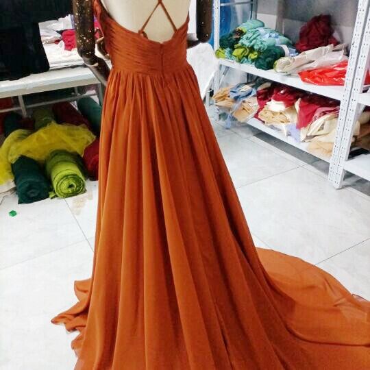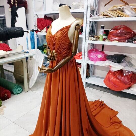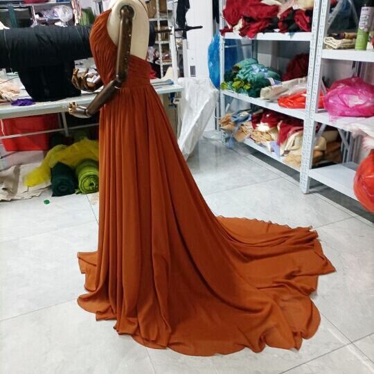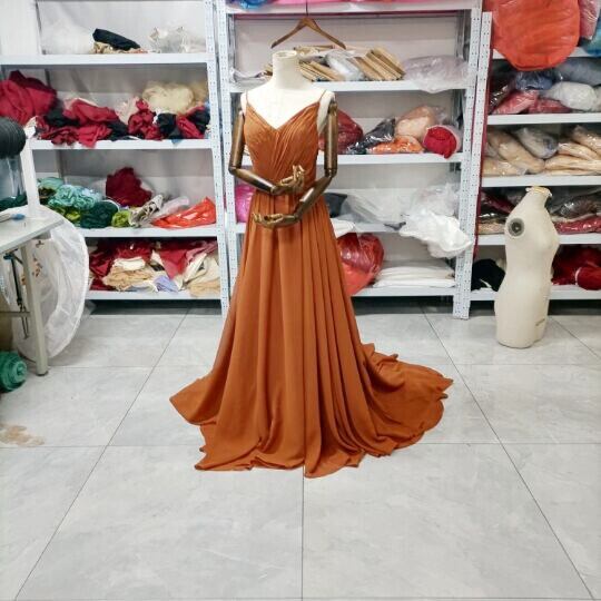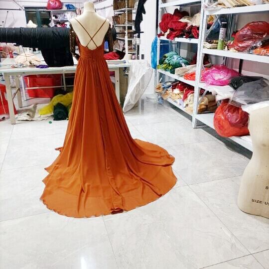 ふんわりシフォン製 テラコッタカラードレス Vネックドレス キャミソール ロングトレーン パーティードレス