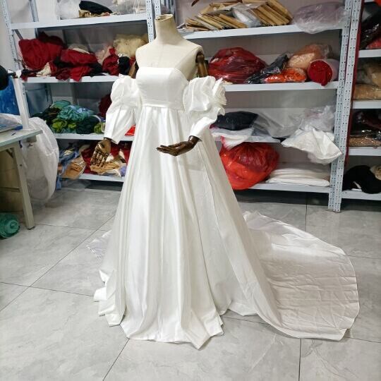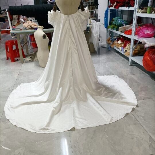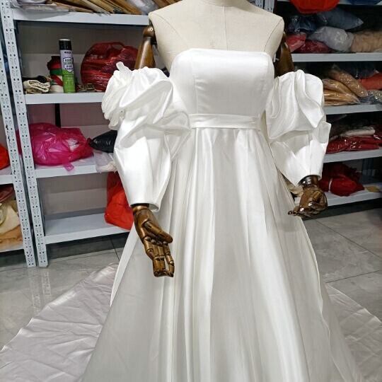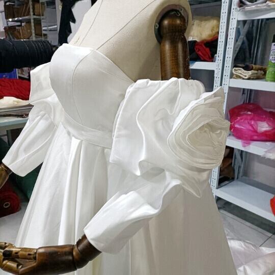 高級サテン 取り外し袖 オフホワイト ショルダーの付け袖 パフスリーブ バラ付き ウエディングドレス 華やかなトレーン