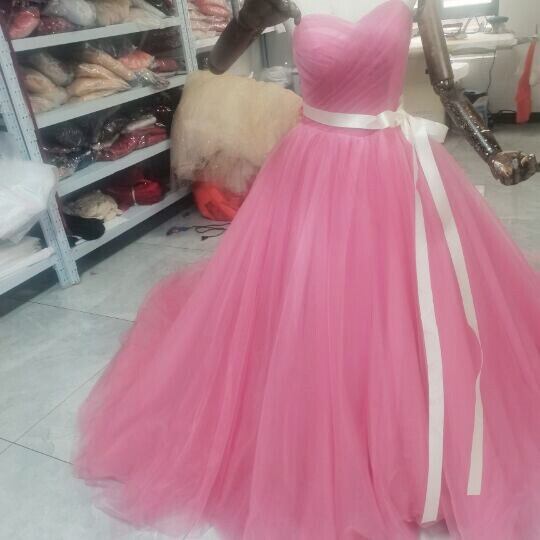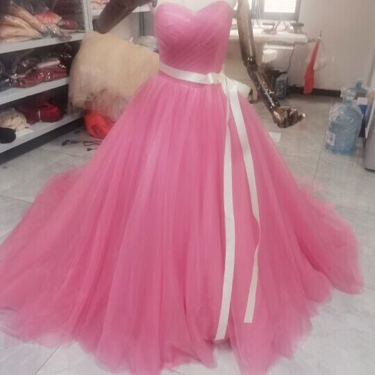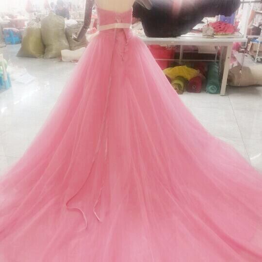 高品質!ベアトップ カラードレス チェリーピンク ソフトチュール 華やかなトレー/結婚式/披露宴/