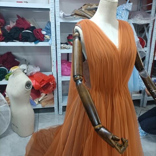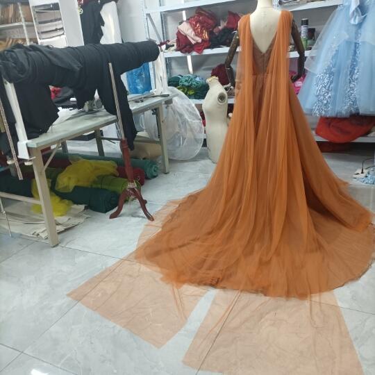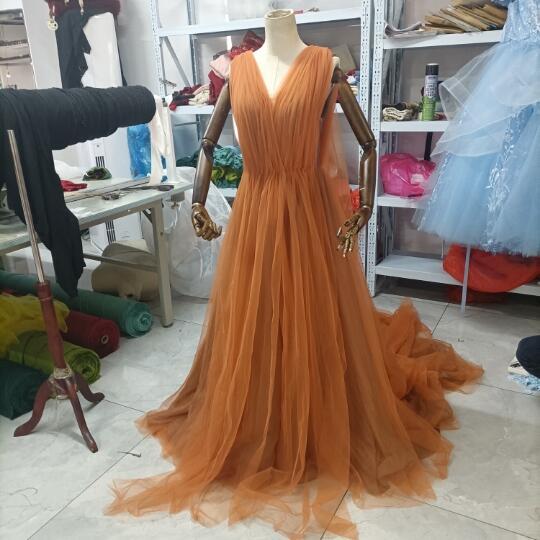 シフォン製 テラコッタカラードレス 前撮り ト Vネックドレス 華やかなトレーン 憧れ/結婚式/披露宴/