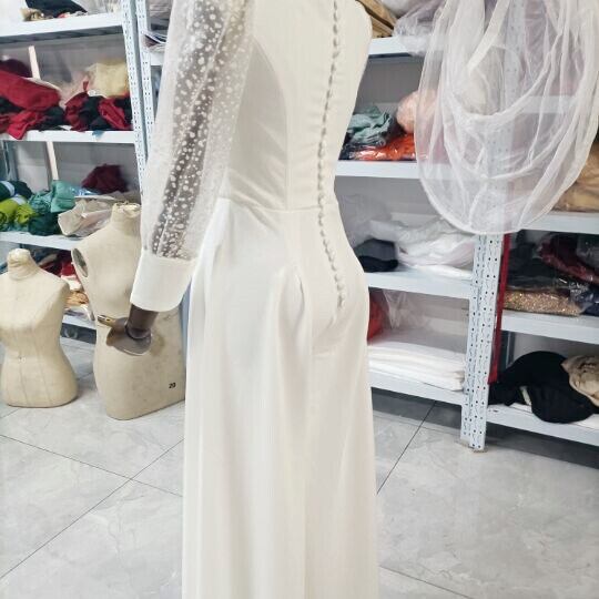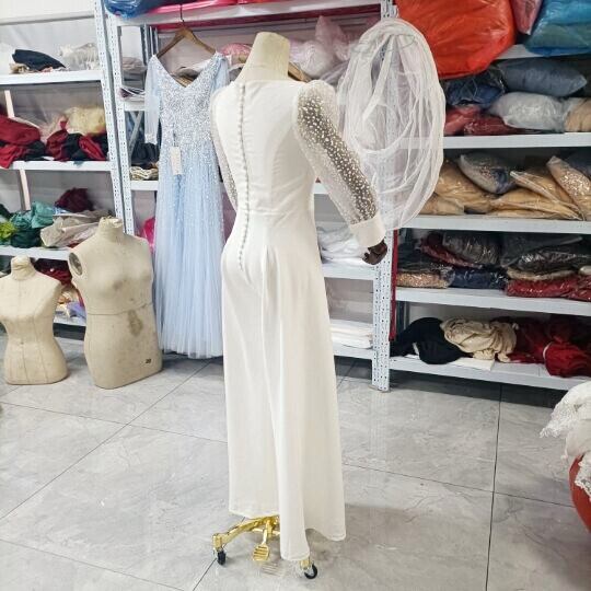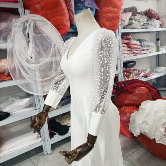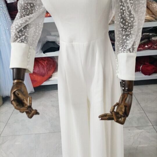 エレガント ホワイト Vネック くるみボタン 上品透け袖 長袖 ワンピース パンツの/音楽会/発表会
