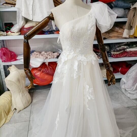 高品質! ウエディングドレス 繊細レース ワンショルダー エレガント
