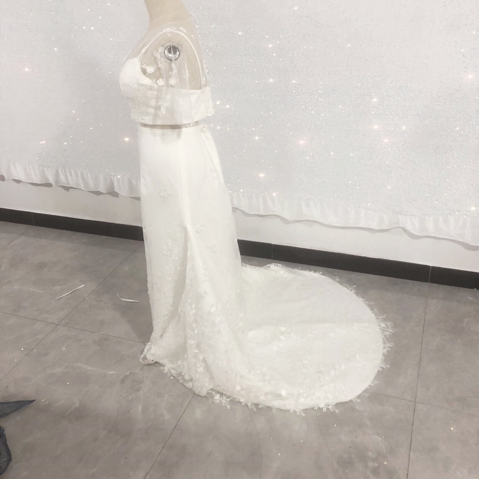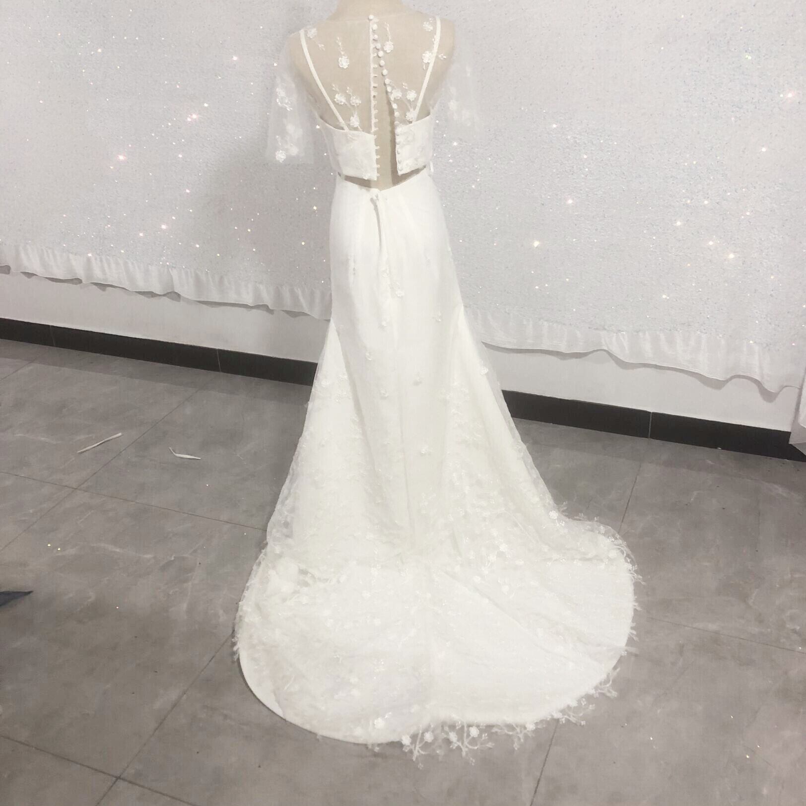 高品質!ツーピース 流れる透け花レース オンショルダードレス ロングトレーン 結婚式/披露宴/