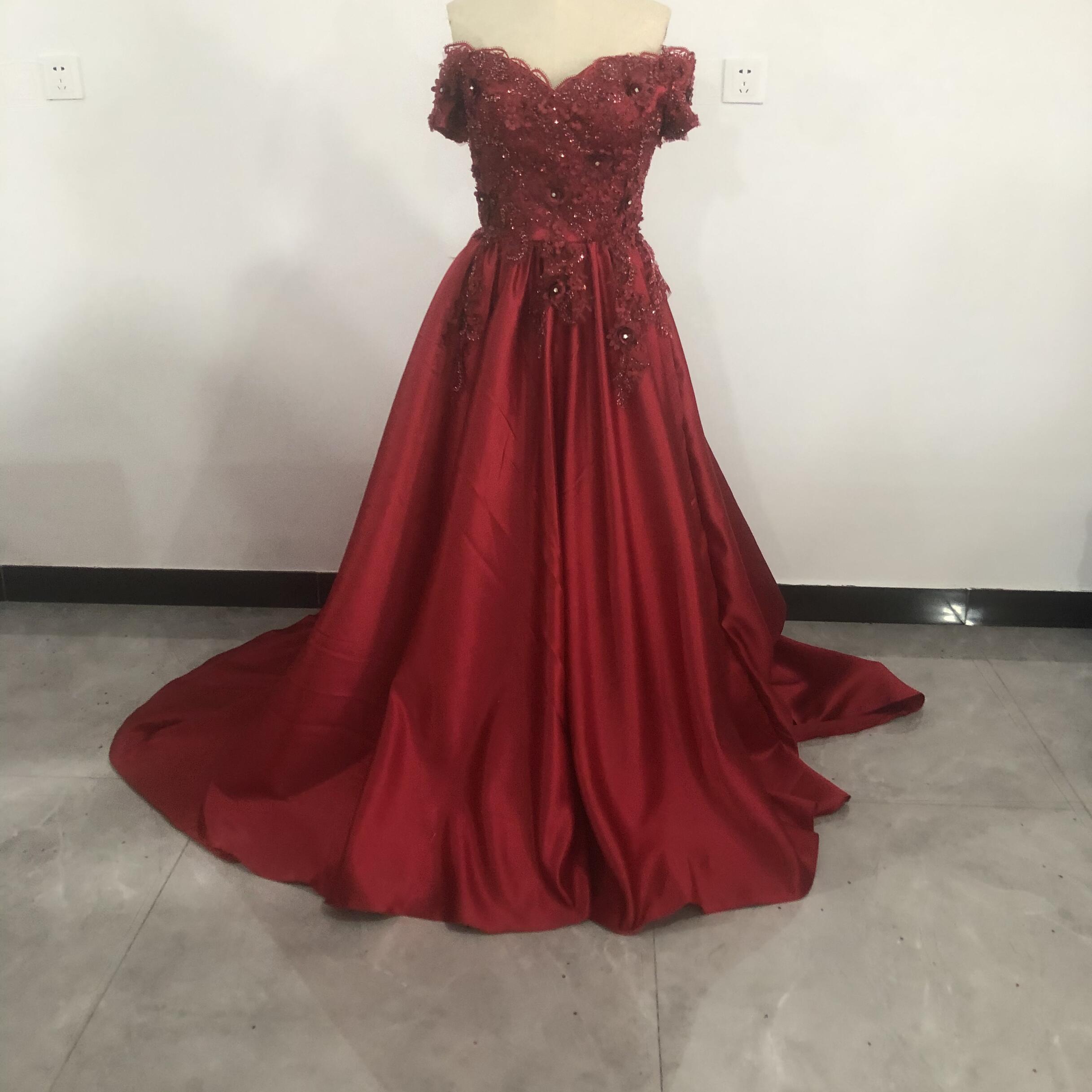 豪華!ワインレッド カラードレス 高級刺繍 贅沢な総レース 薄ゴールド プリンセスライン /結婚式/披露宴/