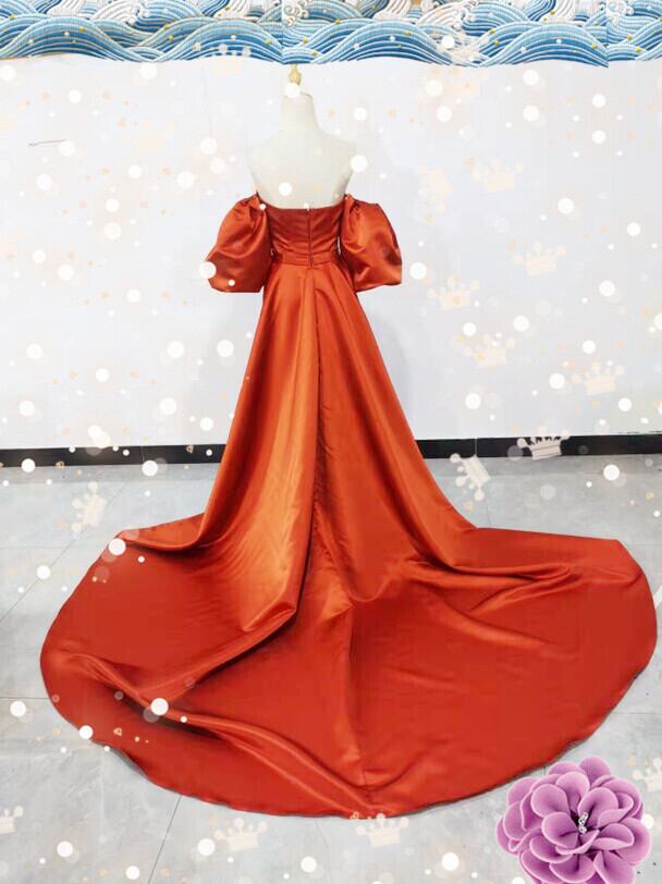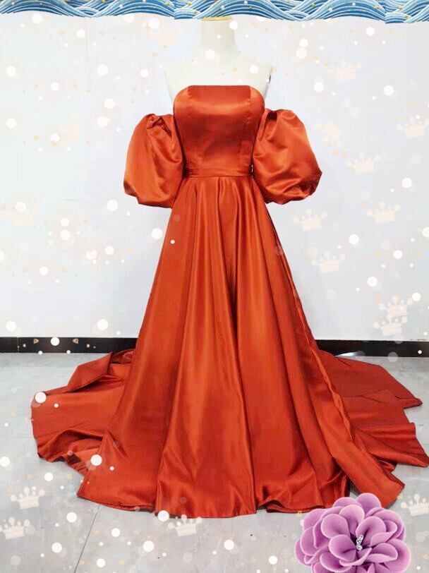 高品質!パーティードレス 前撮り結婚式 2次会 オレンジ ビスチェ オフショルのパフスリーブ
