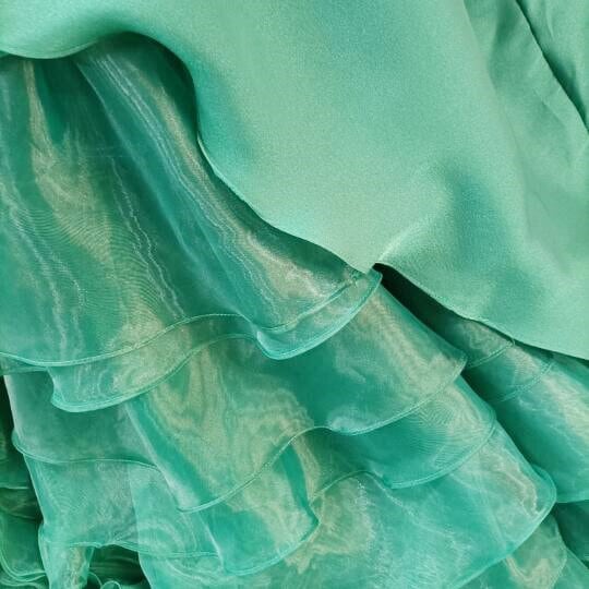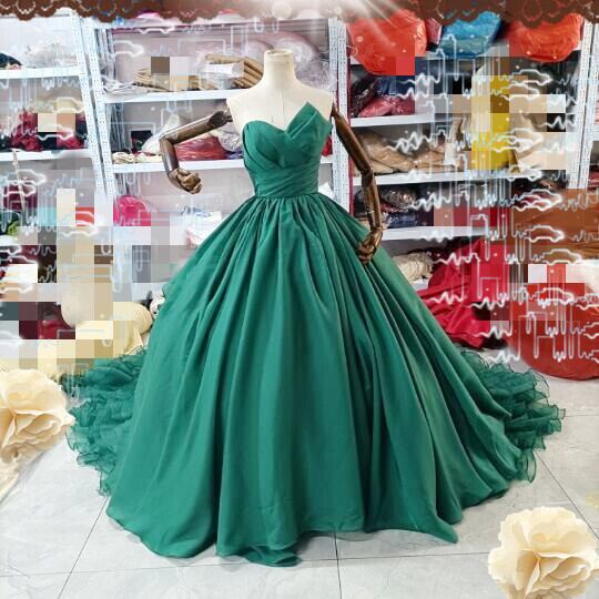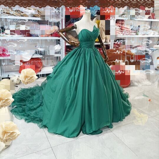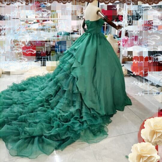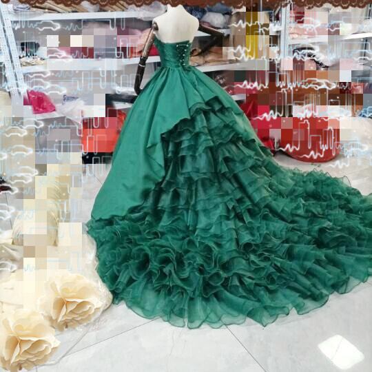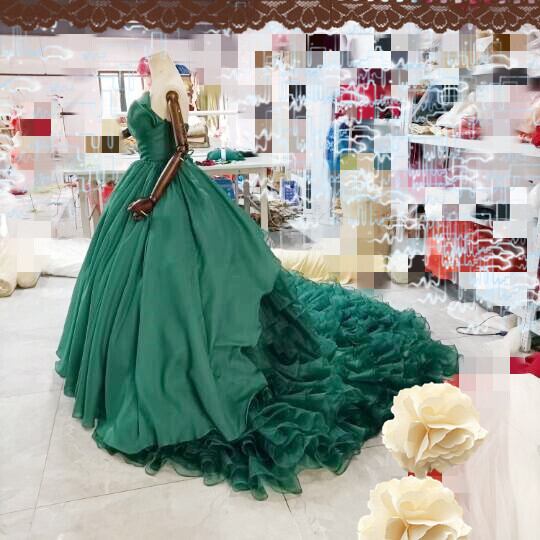 大人気上昇 豪華!グリーン カラードレス ラッフルフリル 華やかなトレーン プリンセスライン /結婚式/披露宴