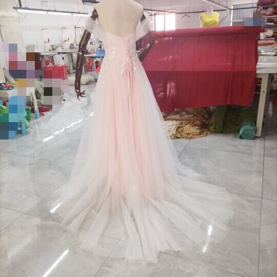 結婚式のベビーピンク カラードレス トレーン ハートカット ソフトチュール裾に繊細レースをあしらった ¥