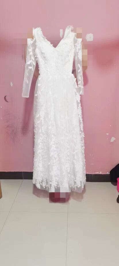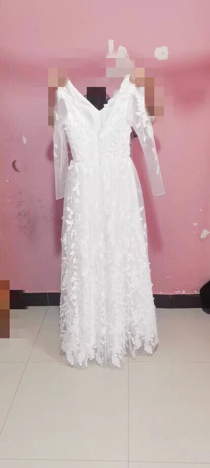 Vネック ウエディングドレス ロング 流れる透け花レース ふわふわ袖 七分袖丈