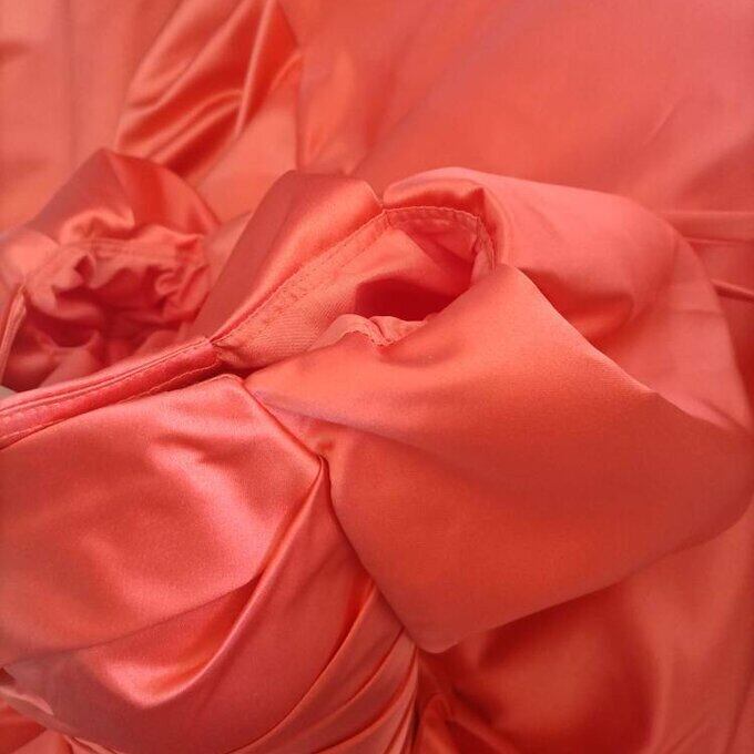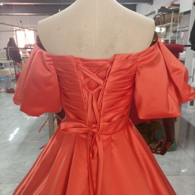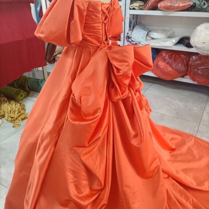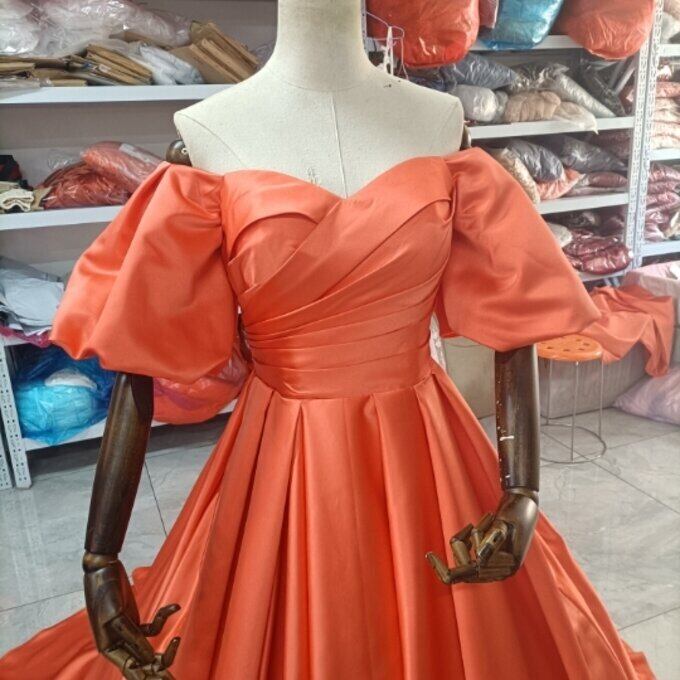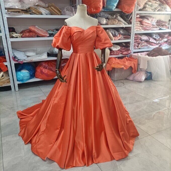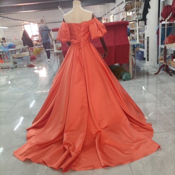 高品質!カラードレス オレンジ色 ベアトップ 光沢サテン 華やかなトレーン 2次会 挙式 前撮り