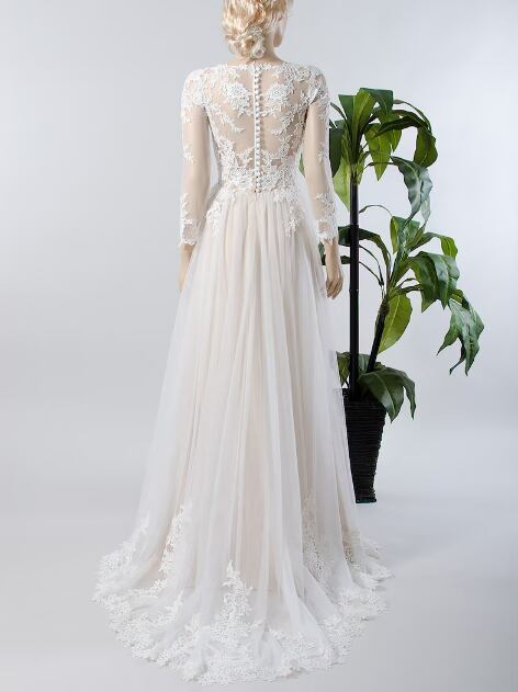 花柄のモチーフ刺繍が美しくパーティードレス/ウエディングドレス 上質オーガンジー Aライン ウェディングドレス///結婚式/披露宴/二次会/リボントレーン フリルトレーン長袖 | David1021k Dress(ダヴィドレス)