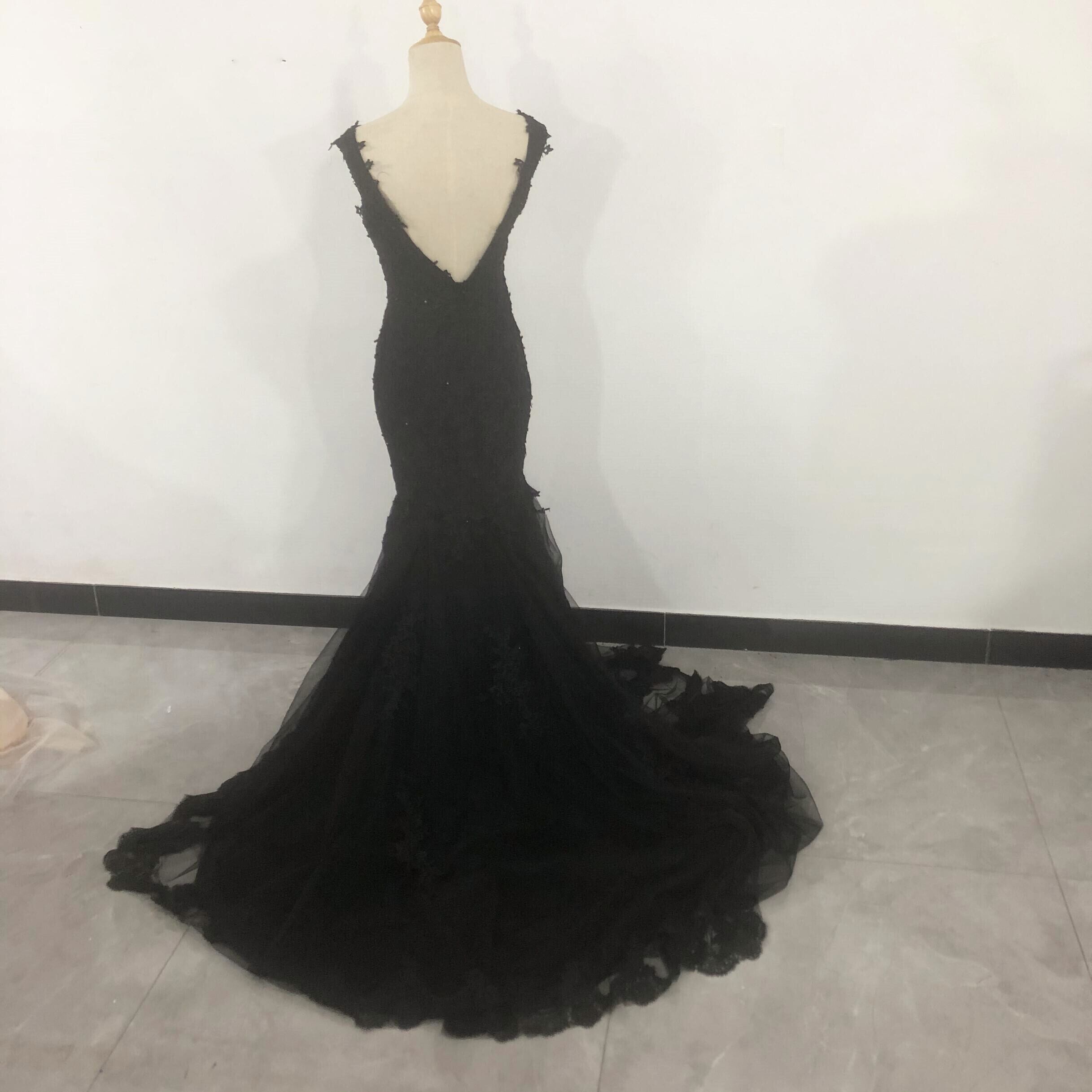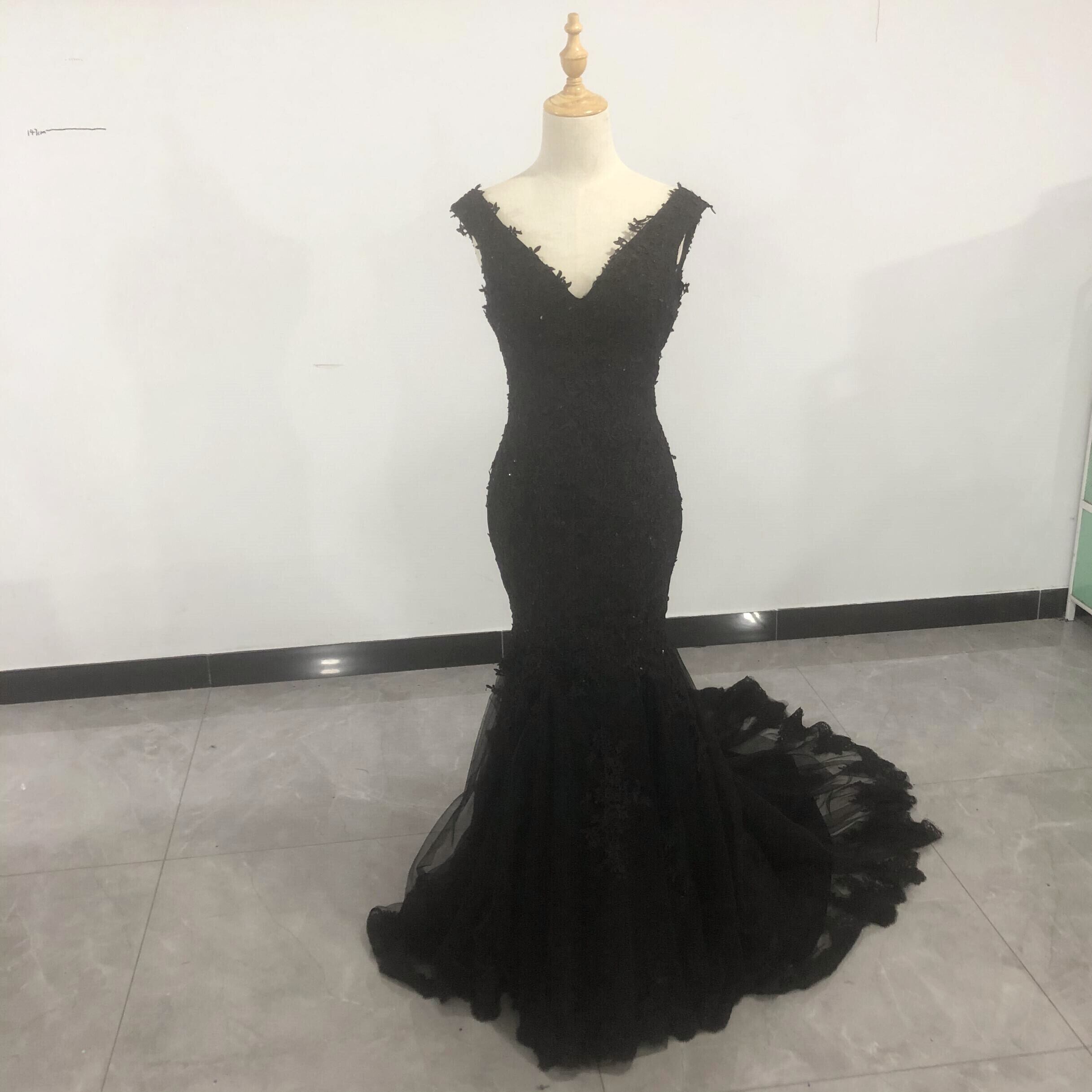 高品質!黒 カラードレス Vネック 上品レース 華やかなトレーン マーメイドライン /2次会/前撮り