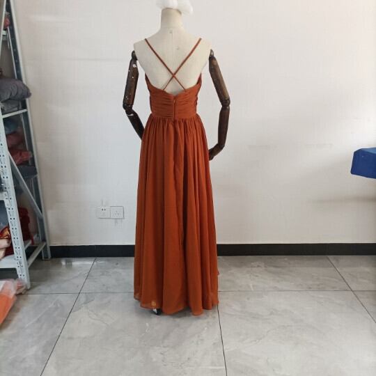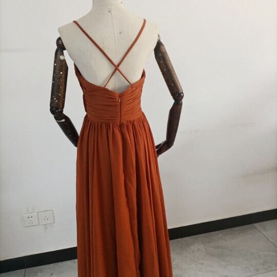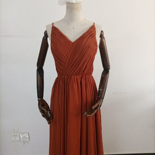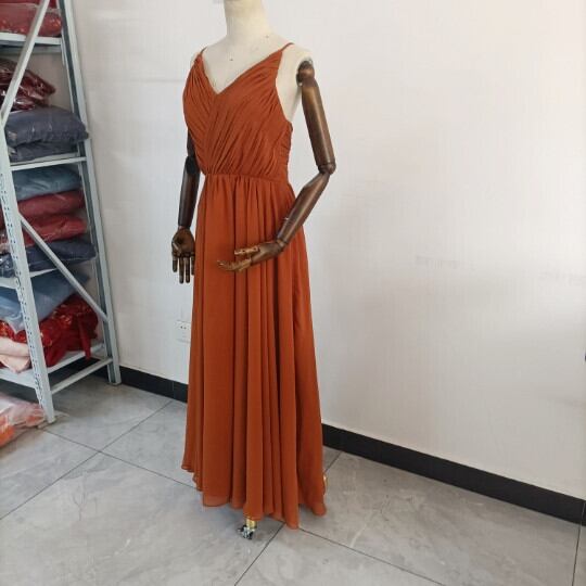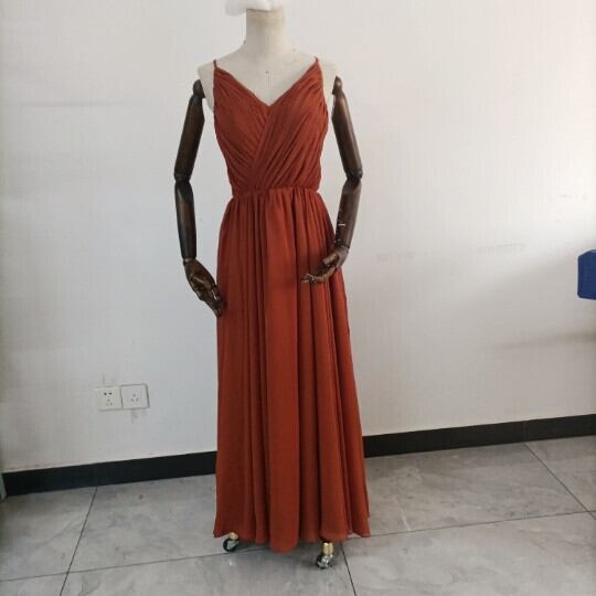 ふんわりシフォン製 テラコッタカラードレス Vネックドレス キャミソール ロングトレーン パーティードレス
