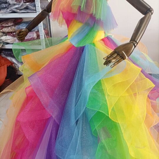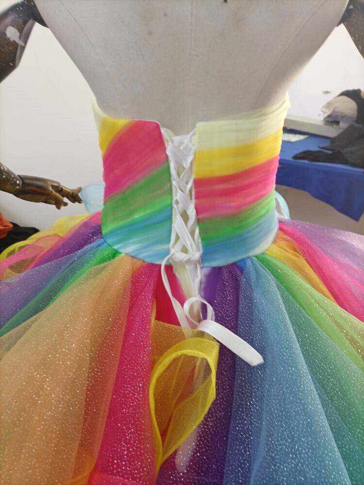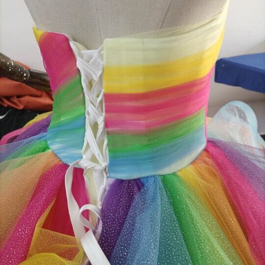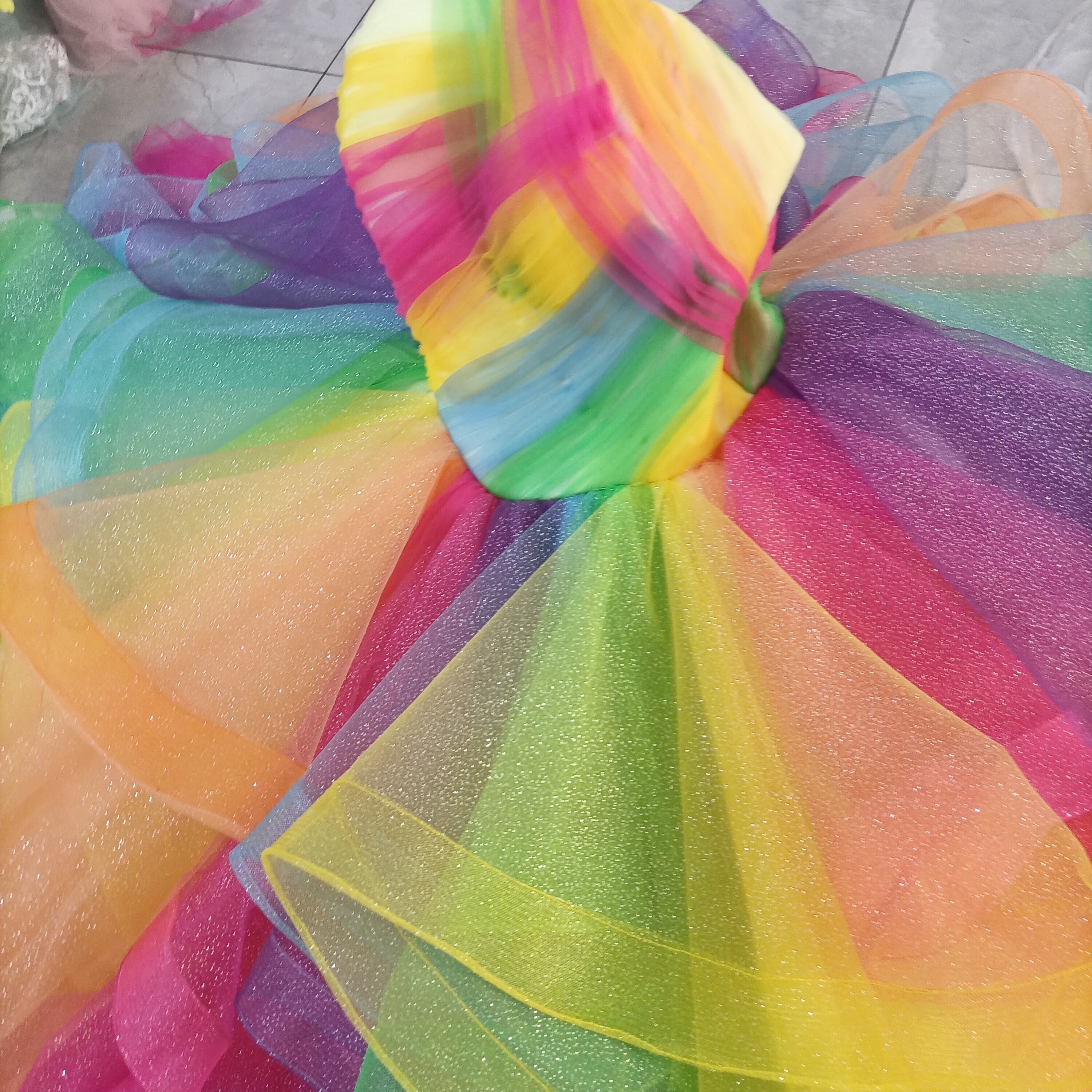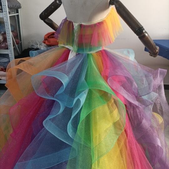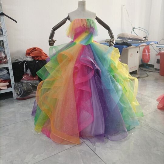 輝きな光彩を放つ レインボー カラードレス ラッフルフリル 挙式 トレーン ベアトップ プリンセスライン 結婚式/披露宴