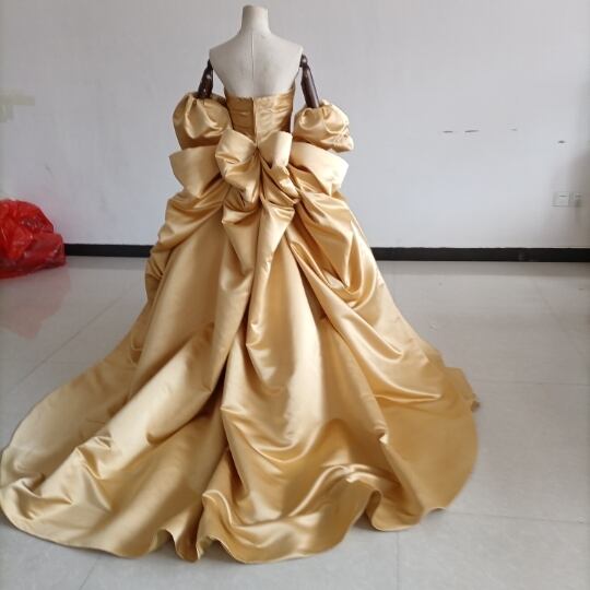 イエローカラードレス ウエディング ベアトップ 取り外しパフスリーブ 豪華なバックリボン/花嫁/結婚式/披露宴/
