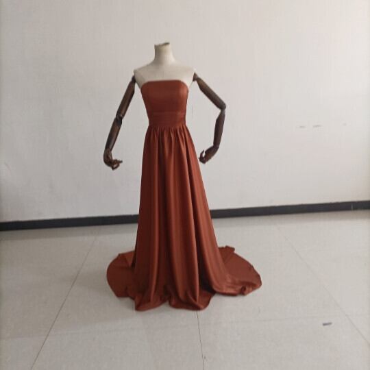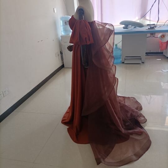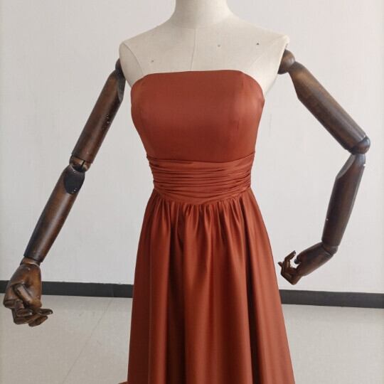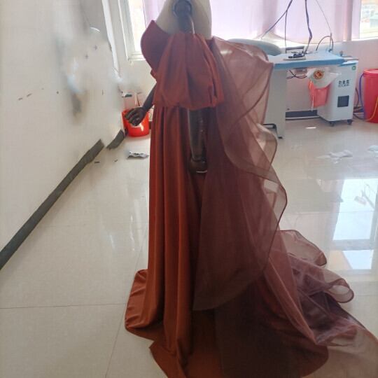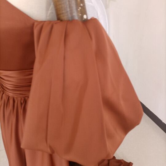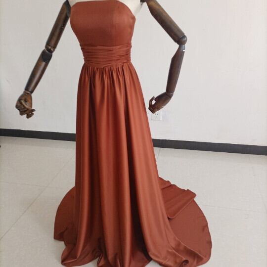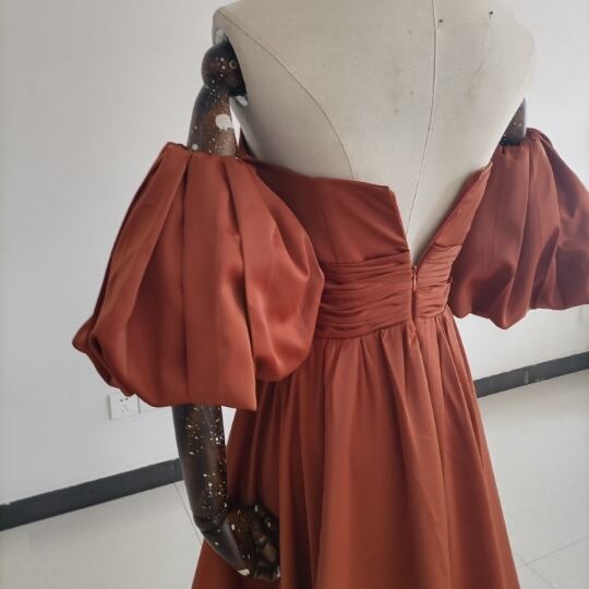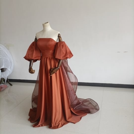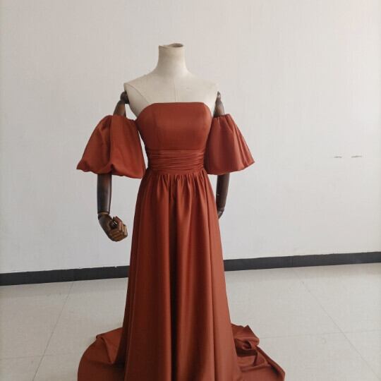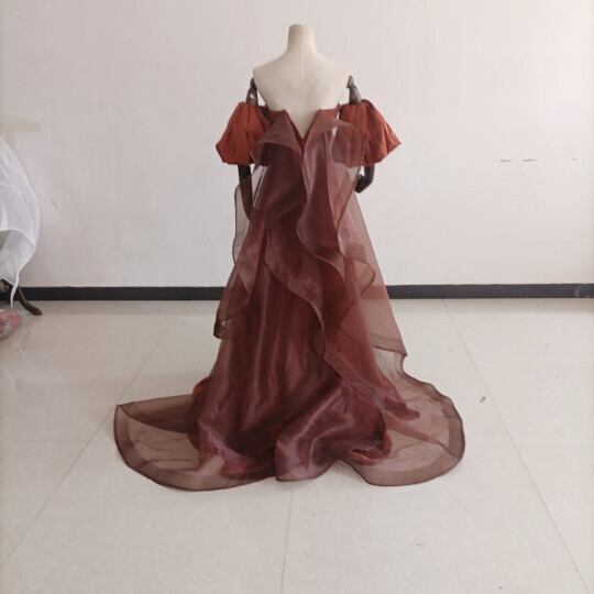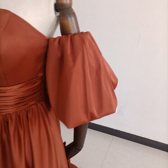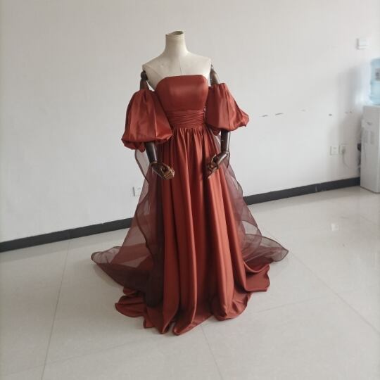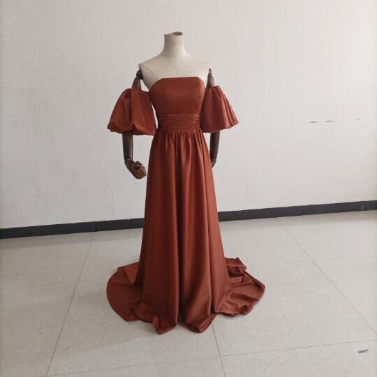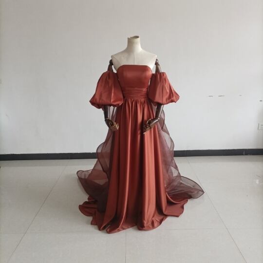 テラコッタ色カラードレス ベアトップ プリンセスライン パフスリーブ オフショル トレーンタイプ/音楽会 発表会