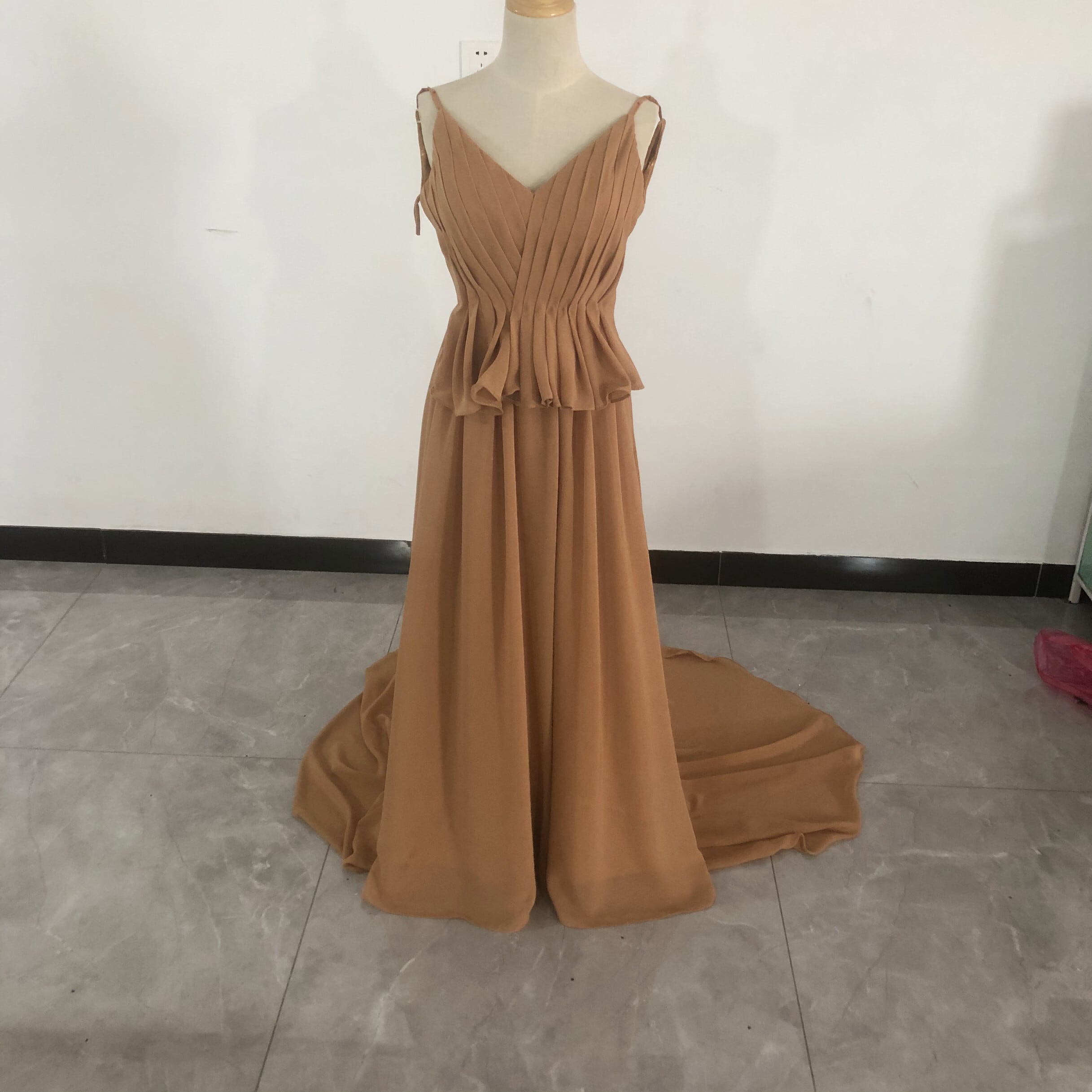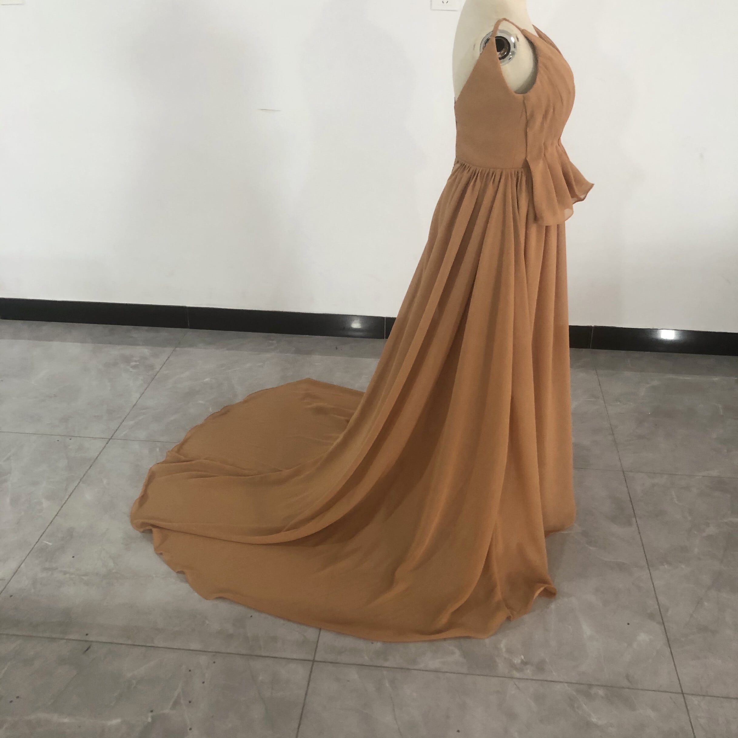 Vネックドレス カラードレス テラコッタ色 イエロー/黄色い 背中見せ トレーン 披露宴/二次会/2次会/挙式/前撮り パーティードレス フリル イブニングドレス 合コン ミディアムドレス 演奏ドレス オーダードレス | David1021k Dress(ダヴィドレス)