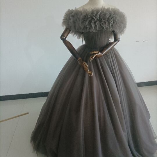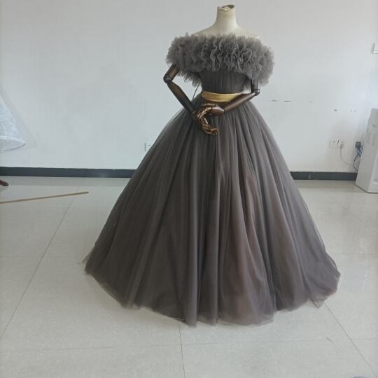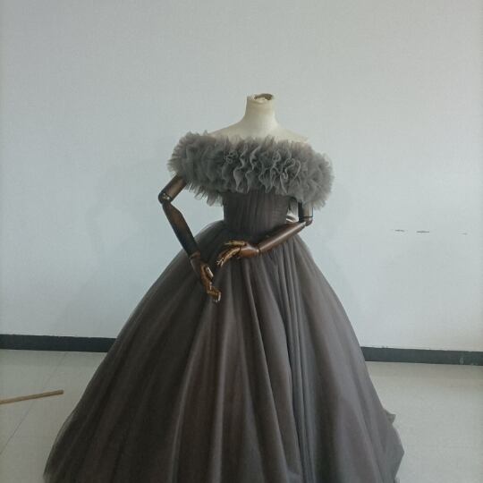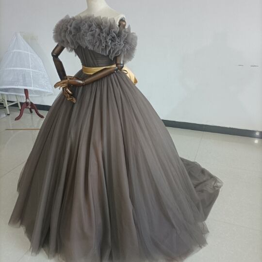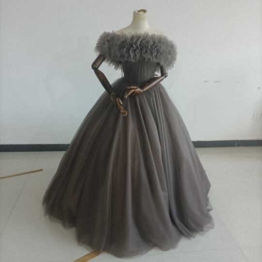 ブラウンカラードレス オフショルダーの2WAYドレス ロングトレーン パーティードレス お色直し