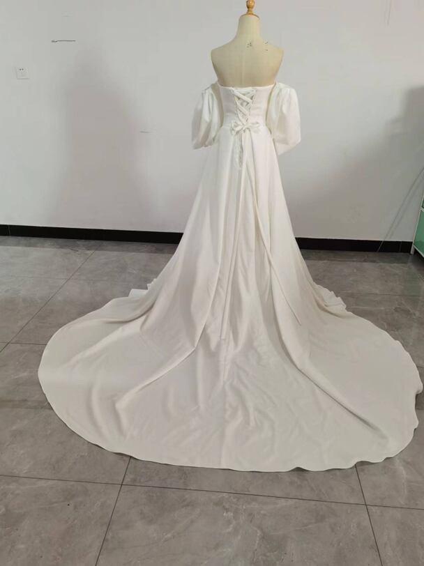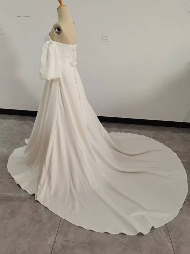 人気上昇 オフショル ホワイト パーティードレス 二次会 前撮り 挙式 パフスリーブ マット生地 ウエディングドレス