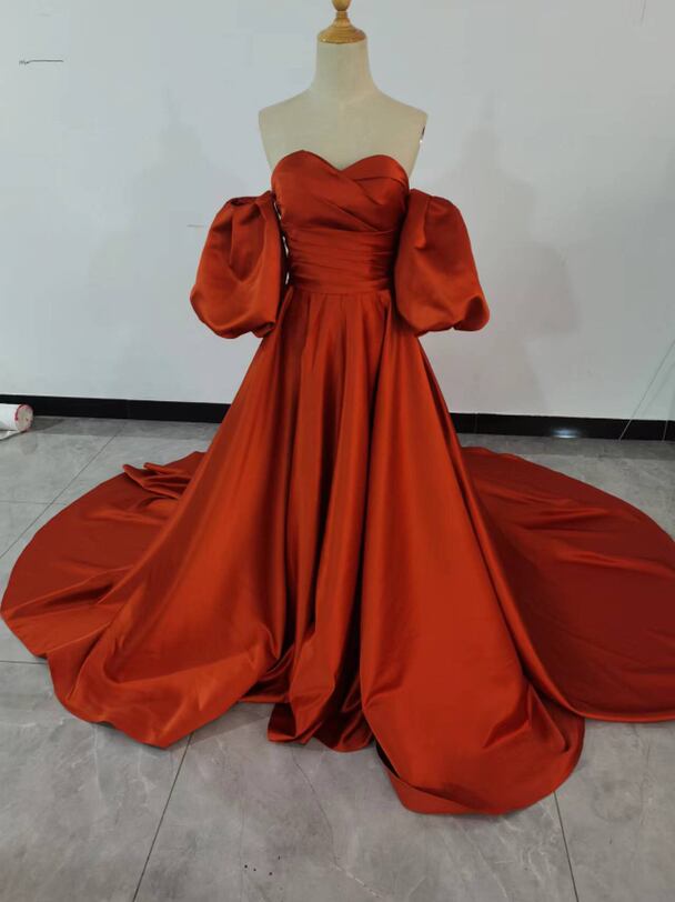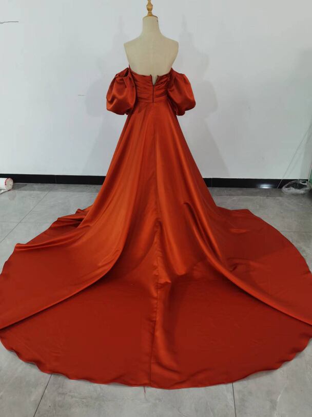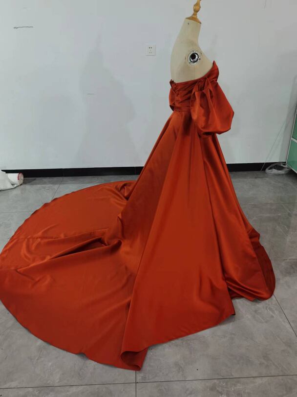高品質!パーティードレス 前撮り結婚式 2次会 オレンジ ビスチェ オフショルのパフスリーブ