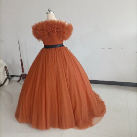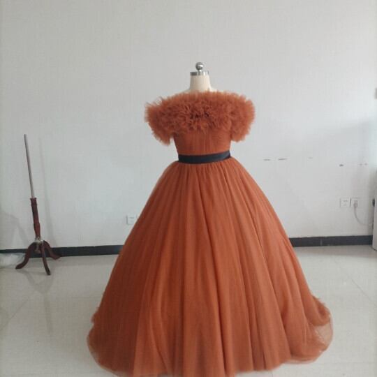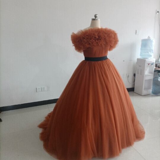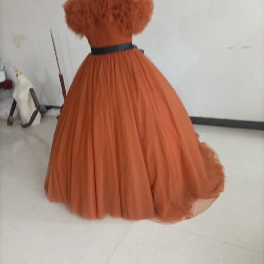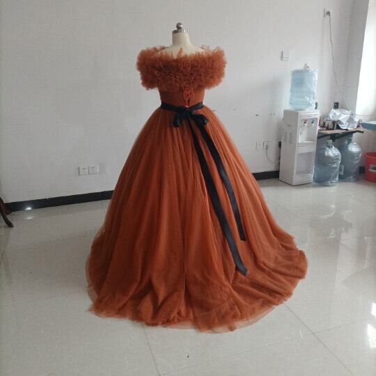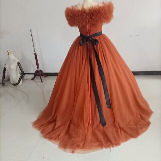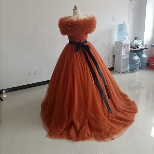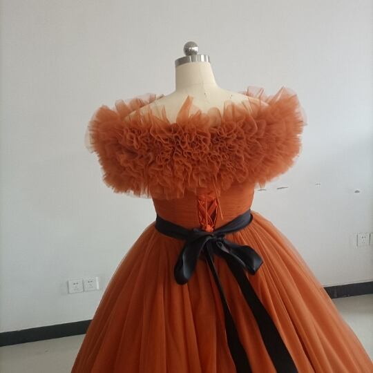 高品質! パーティードレス テラコッタ色 トレーン ボリューミー取り外し可能オフショル 編み上げ カラードレス