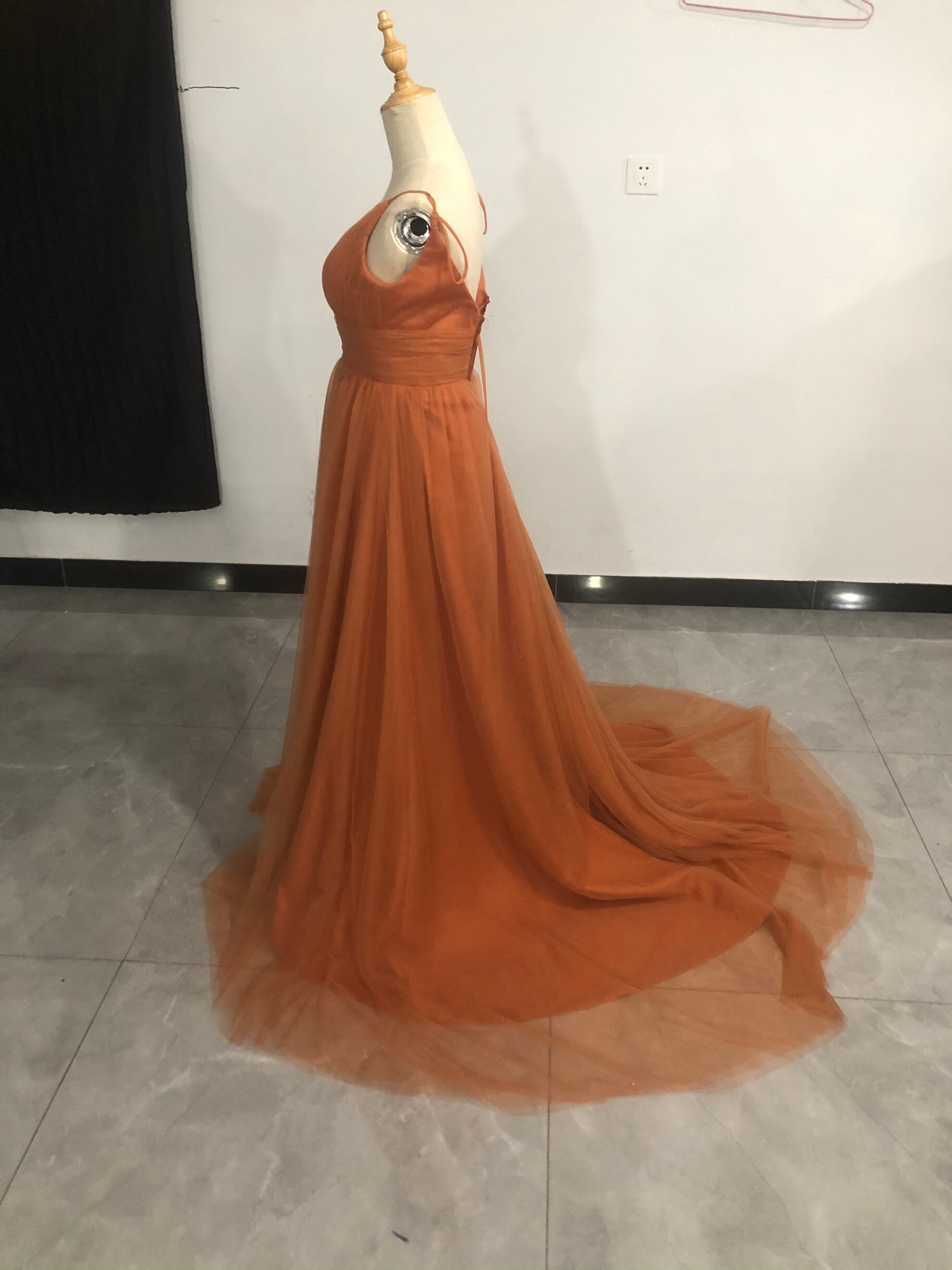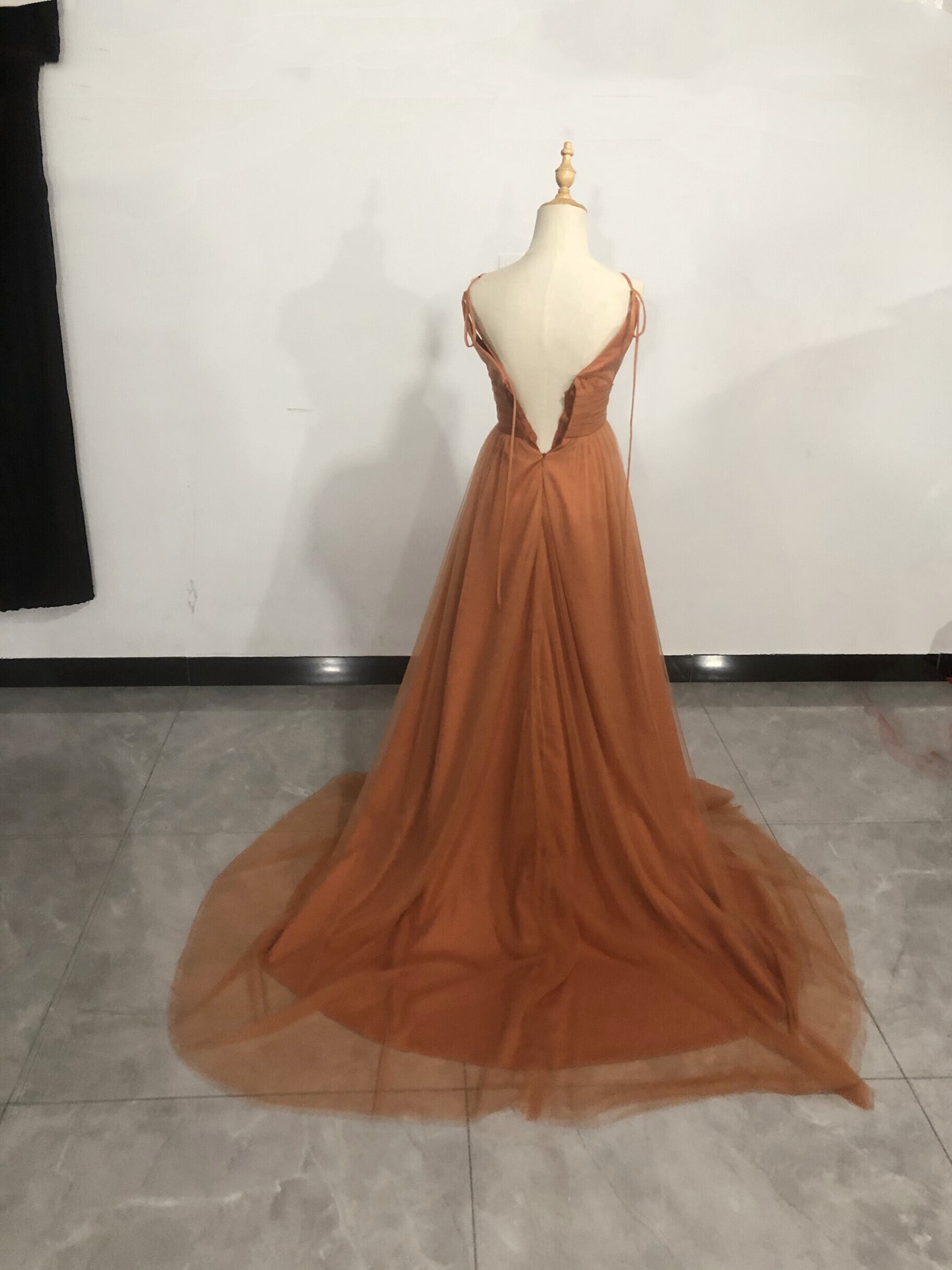 雅やか テラコッタ色 カラードレス 背中見せ 短トレーン Vネック お呼ばれ 二次会