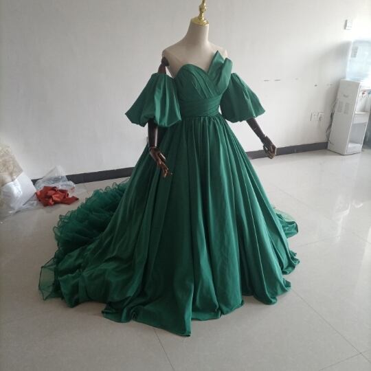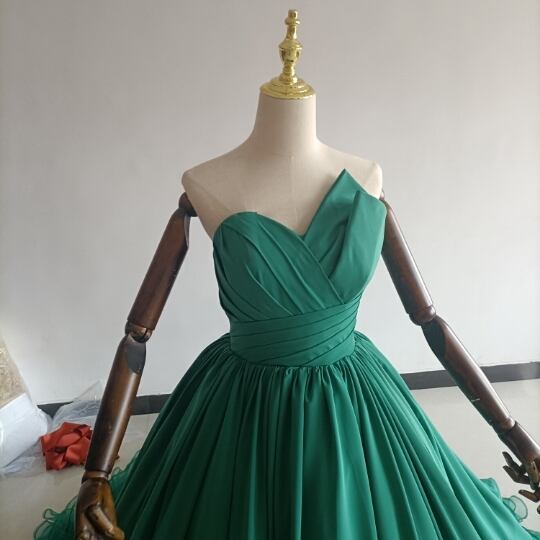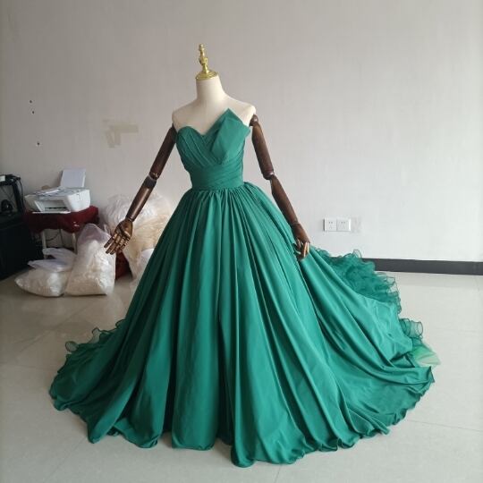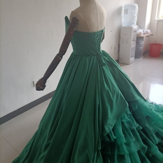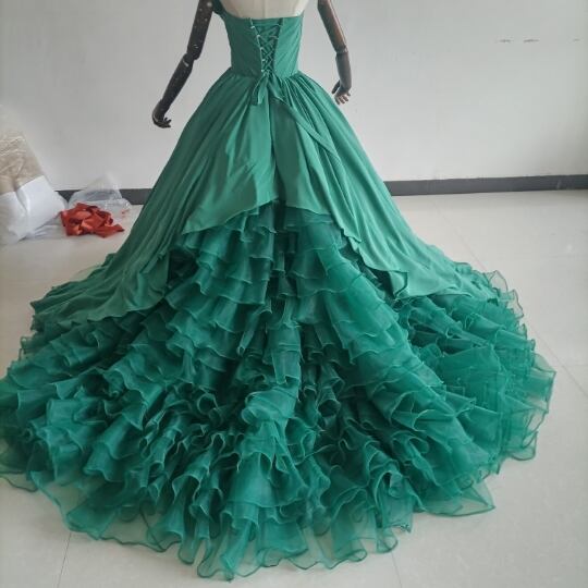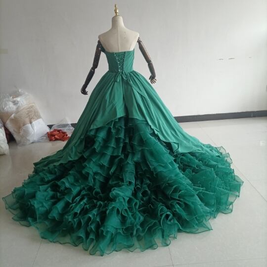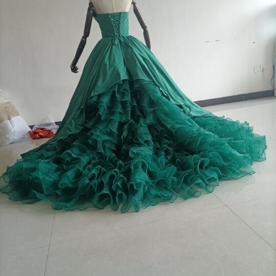 大人気上昇 豪華!グリーン カラードレス ラッフルフリル 華やかなトレーン プリンセスライン /結婚式/披露宴