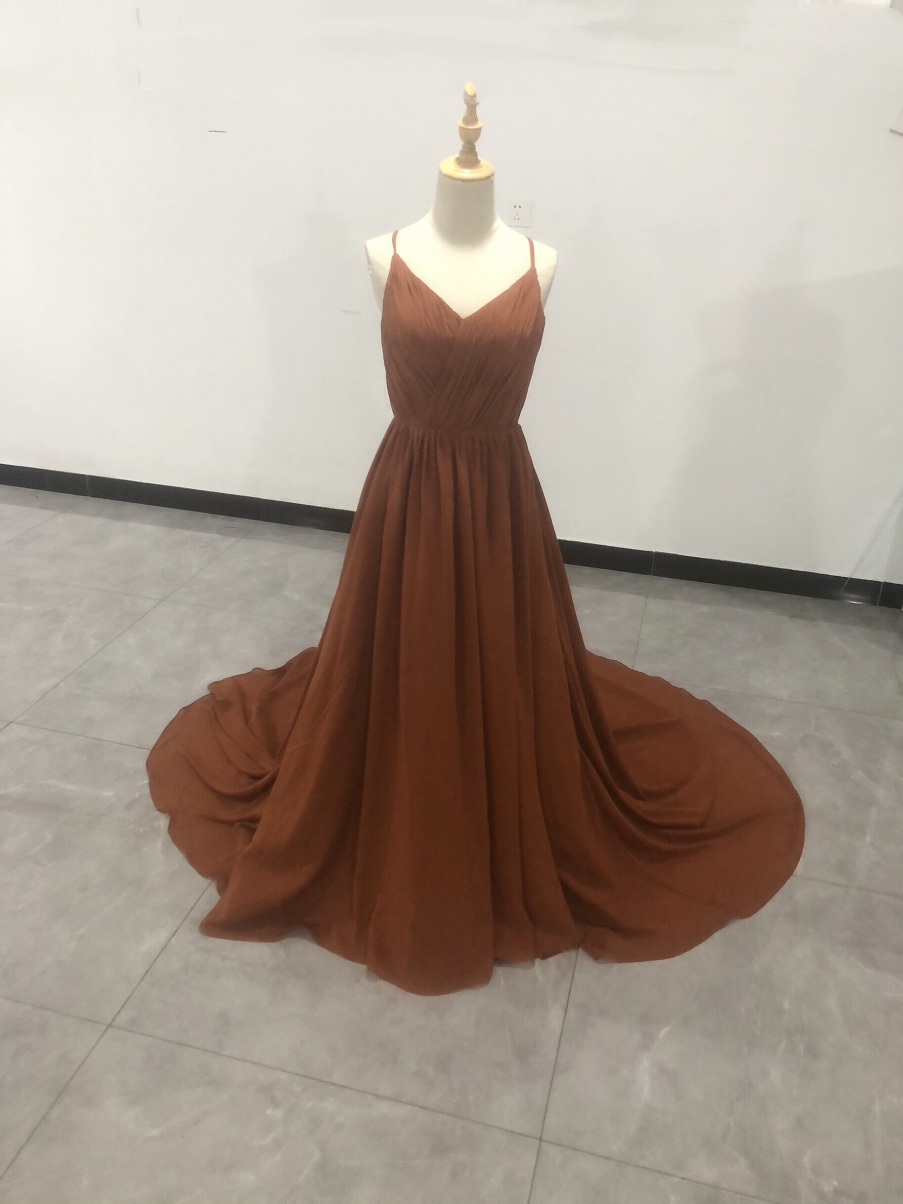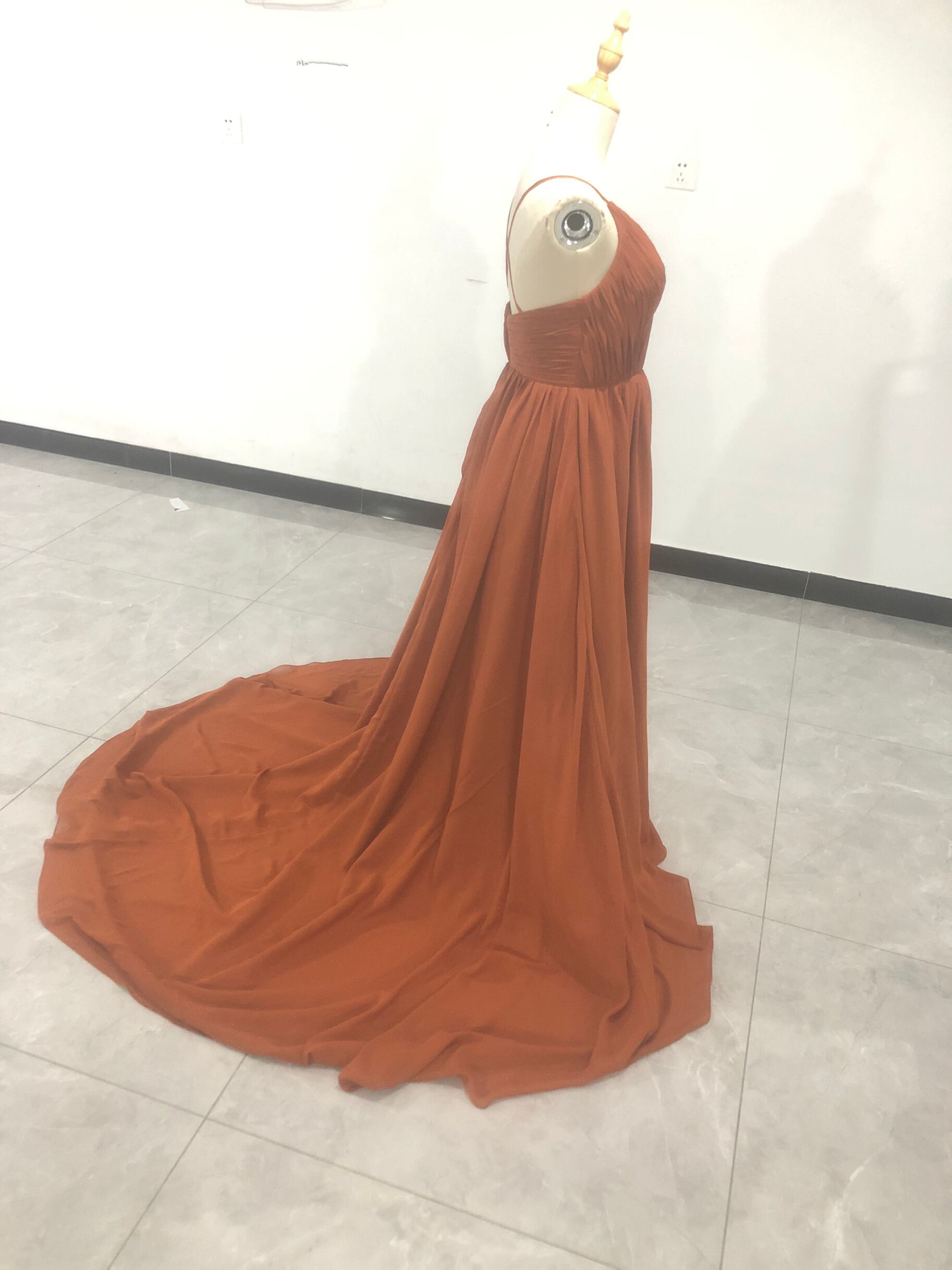 ふんわりシフォン製 テラコッタカラードレス Vネックドレス キャミソール ロングトレーン パーティードレス