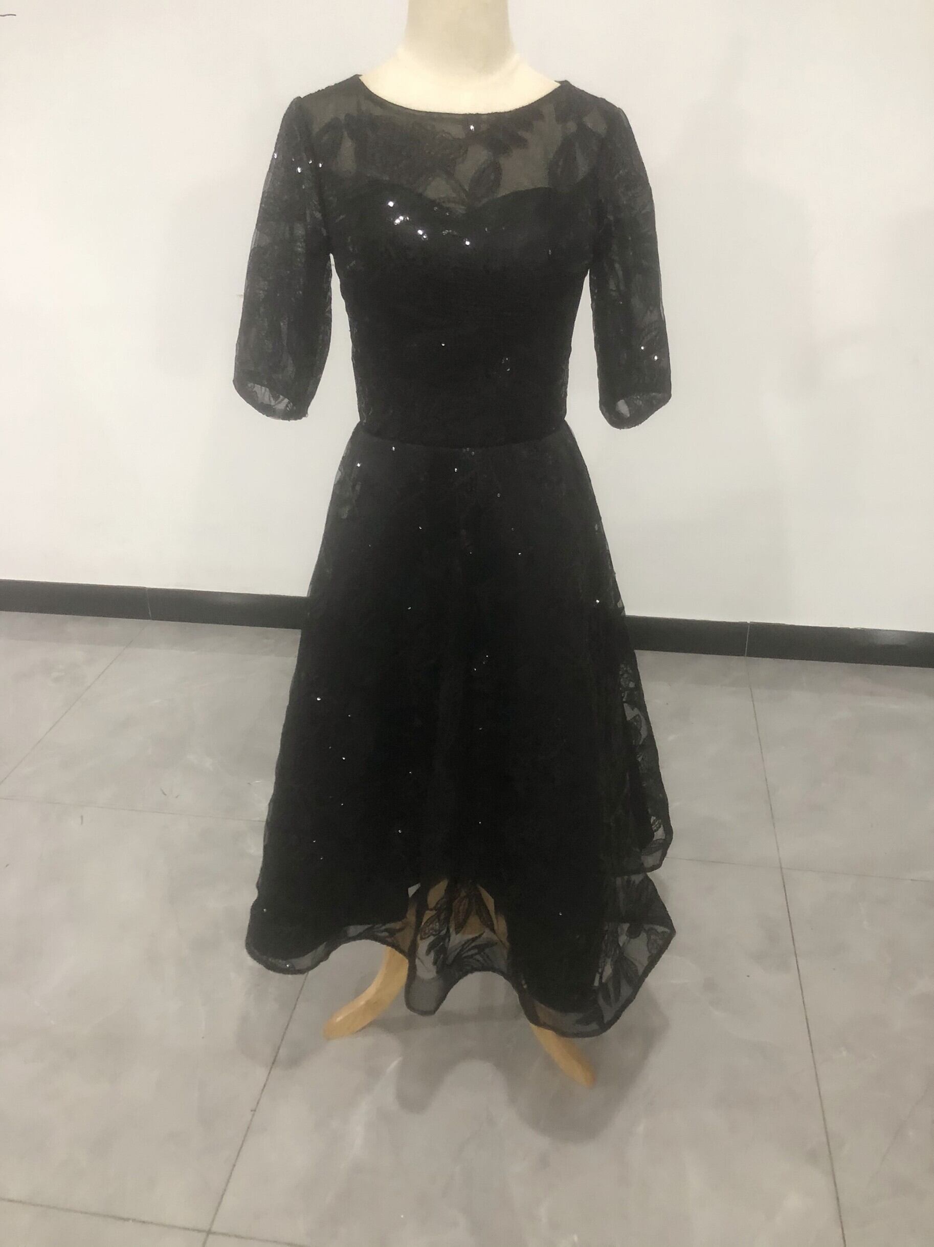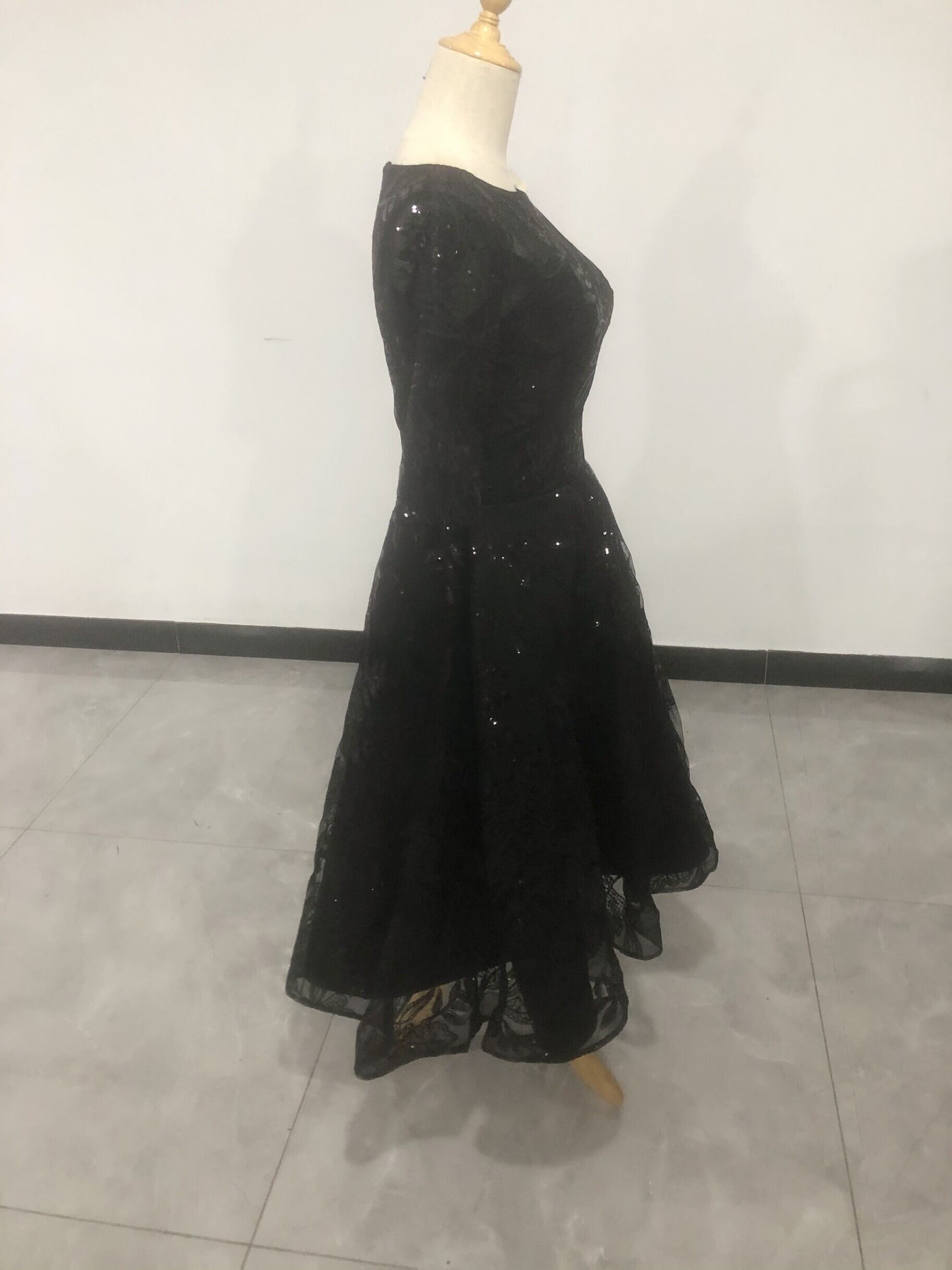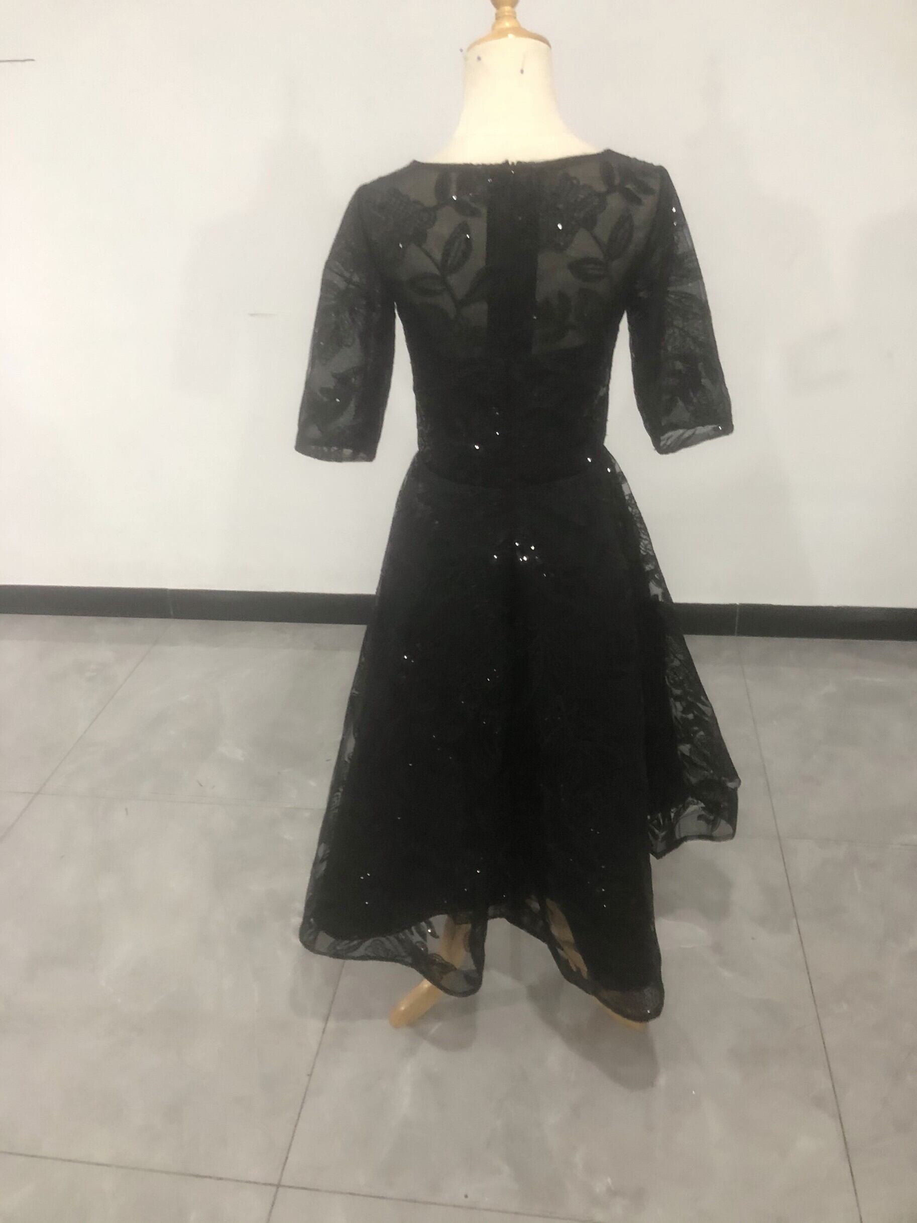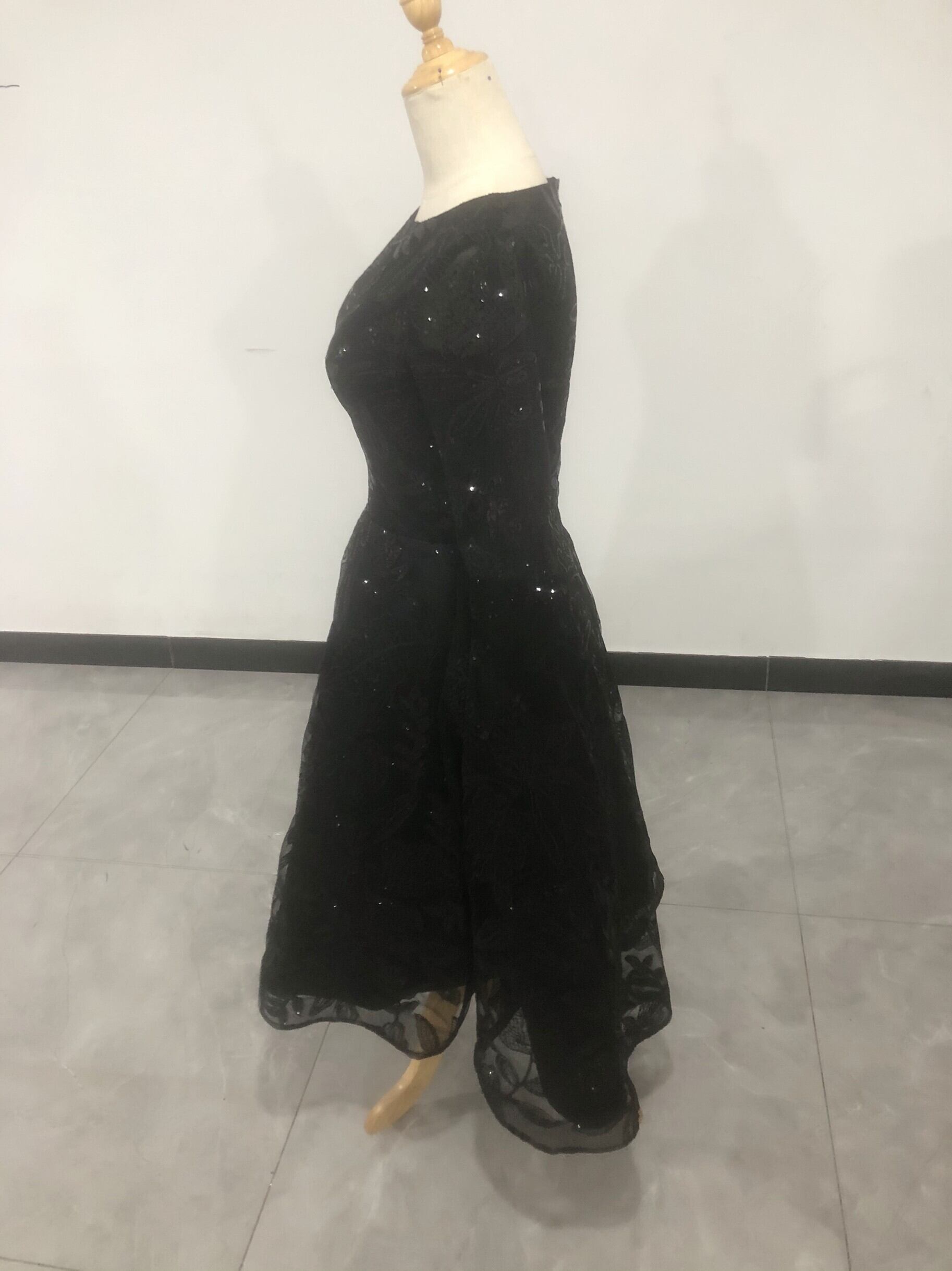 高品質! パーティードレス 黒 ロング 繊細レース ファスナー エレガント 細見えシルエット