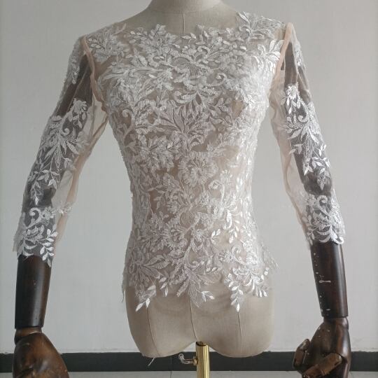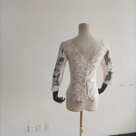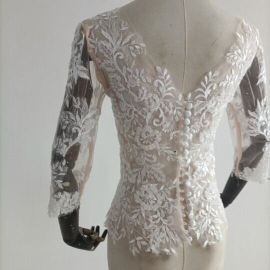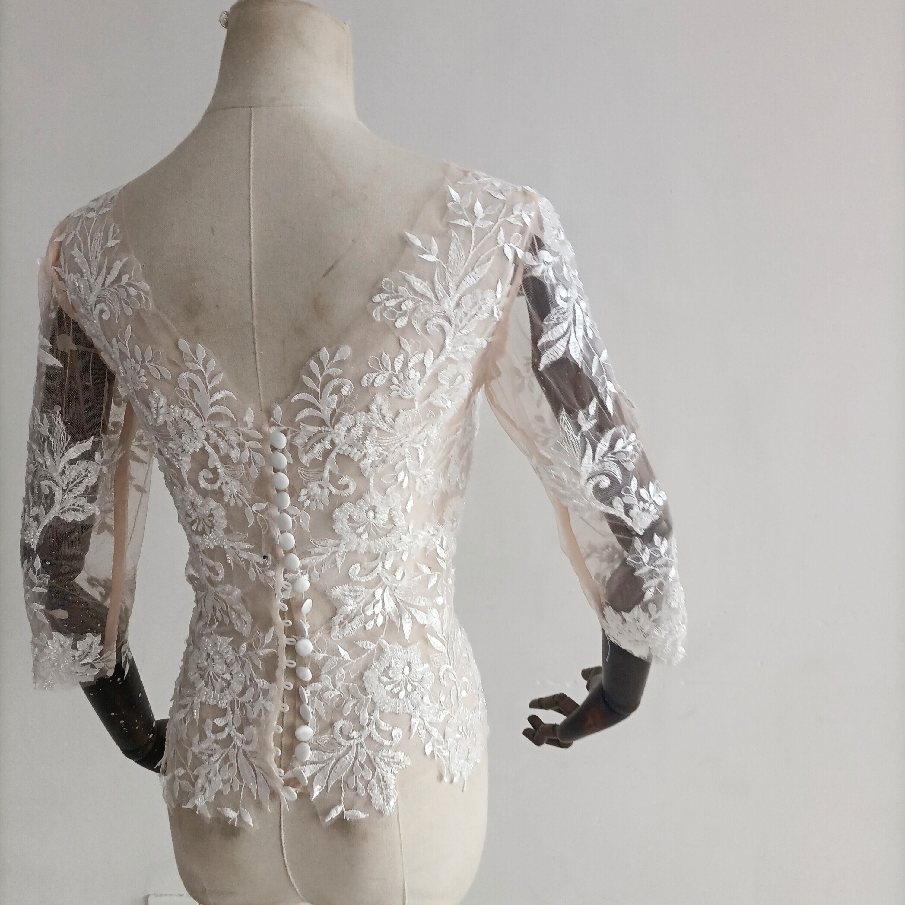 クルーネック  トップス 背中見せVライン 上品透け袖 3D立体レース刺繍 くるみボタン 長袖