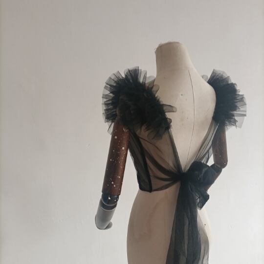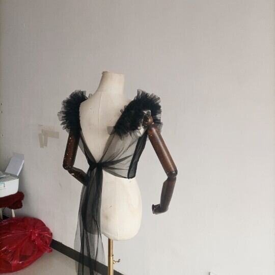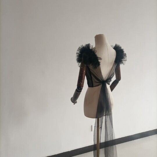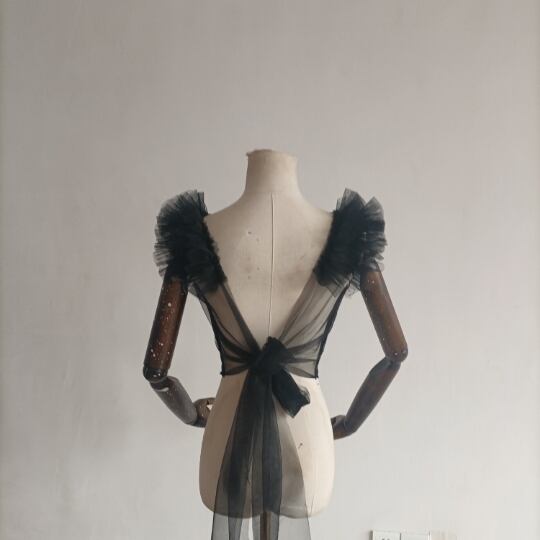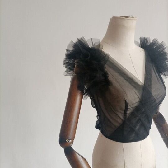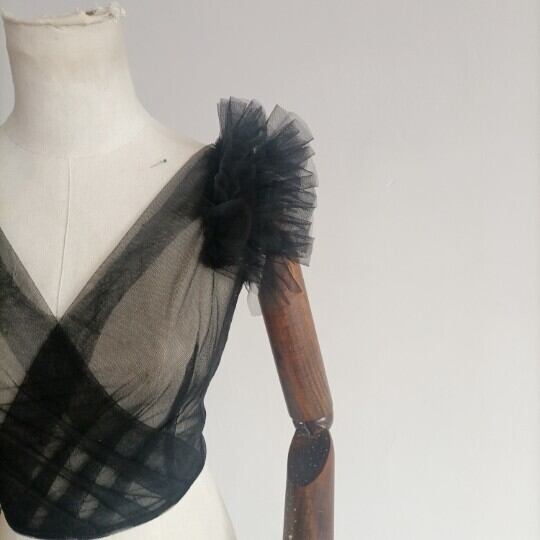 Vネック ブラックフェミニンなフレームチュールの袖トップス
