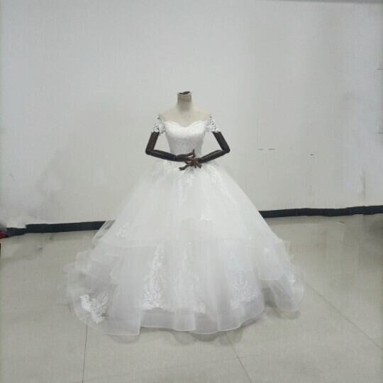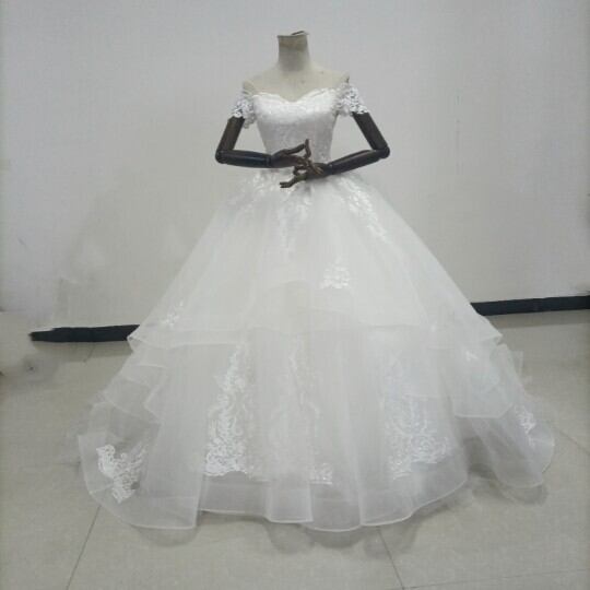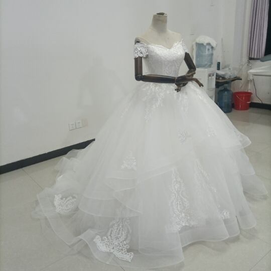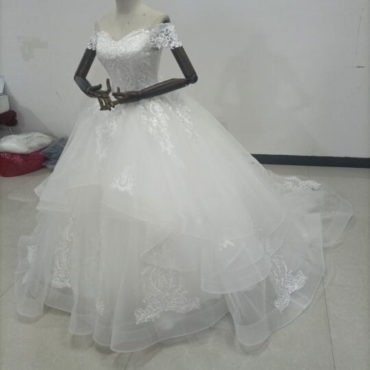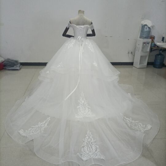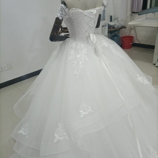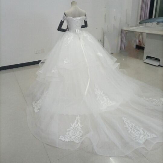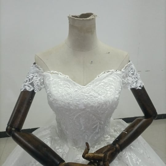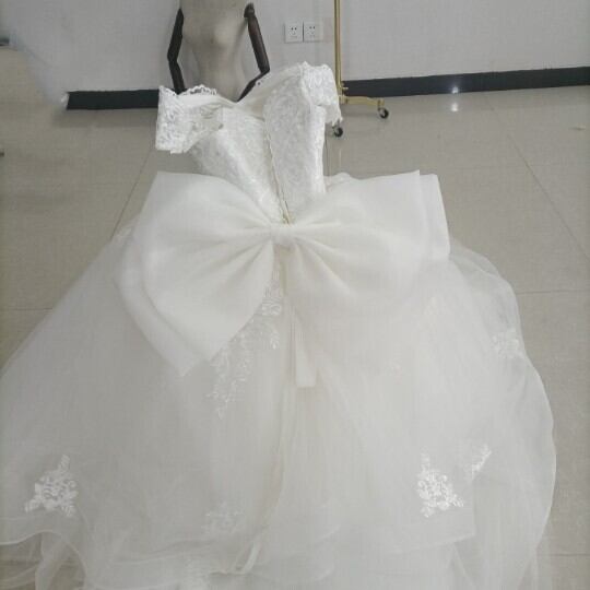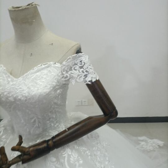 高品質! ウエディングドレス 取り外し襟 オフショルダー ミニトレーン/短トレーン 編み上げ 細見えシルエふっくら柔らか