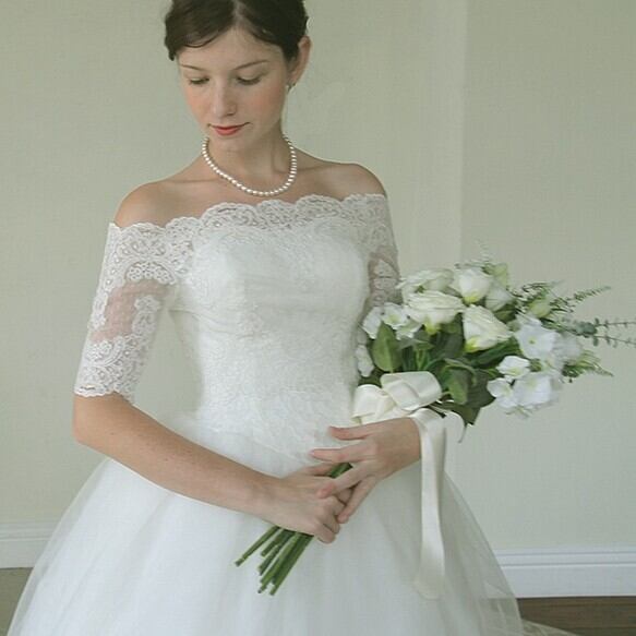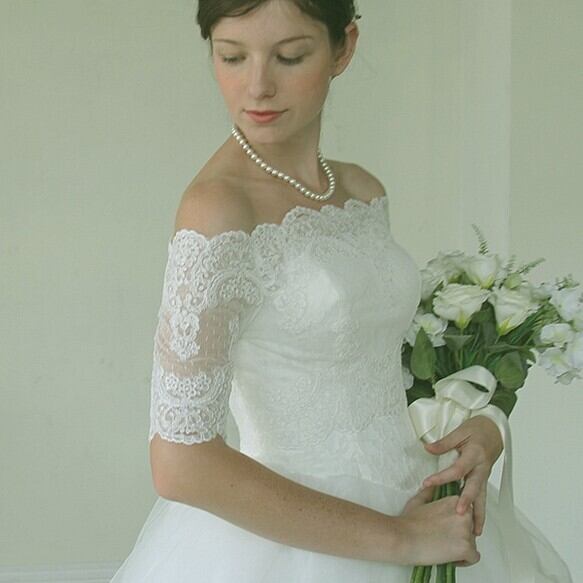 スカラップが美しいラッセルレースの オフショルダーウエディングボレロ【オフショルハーフボレロ】
