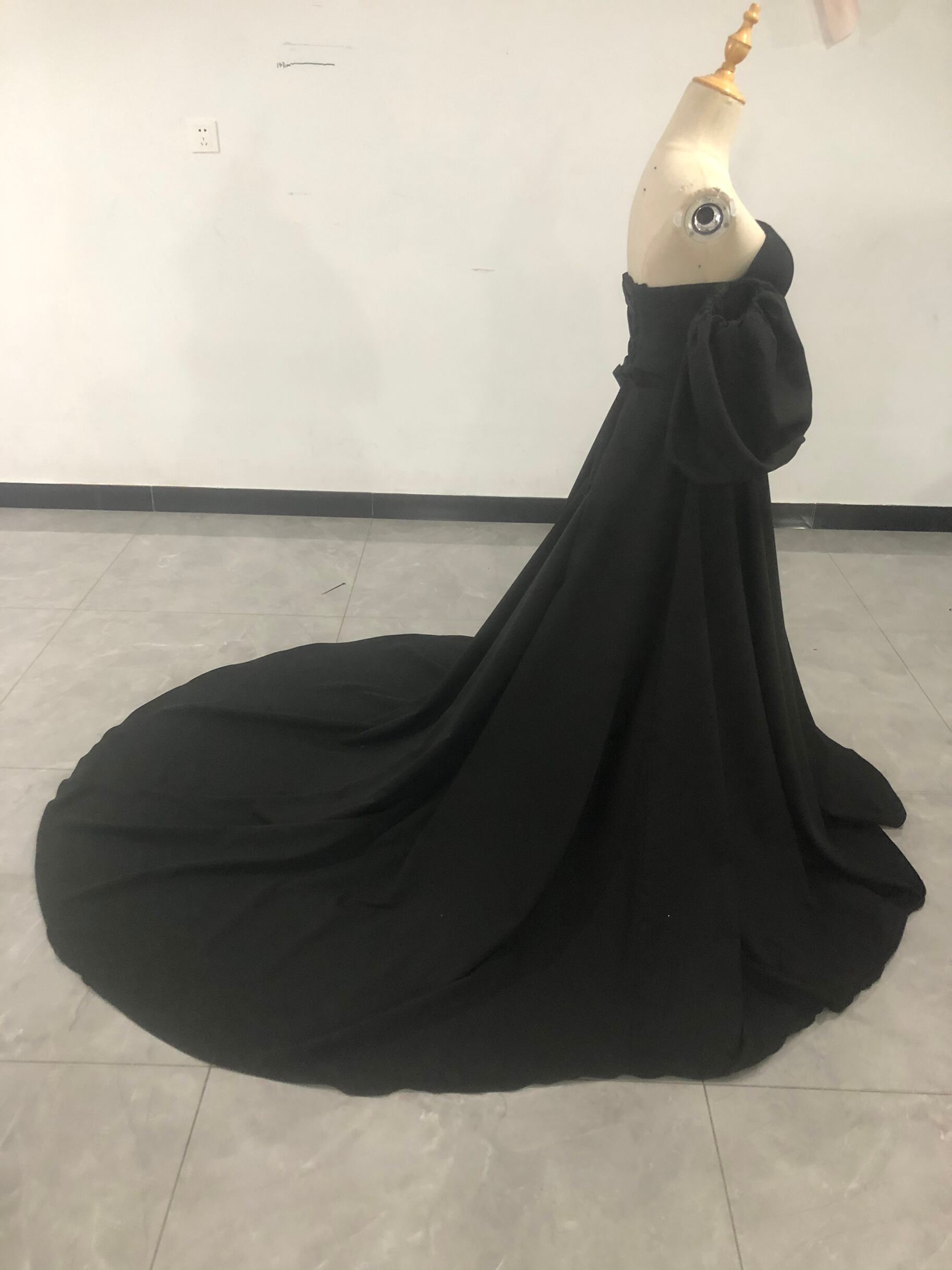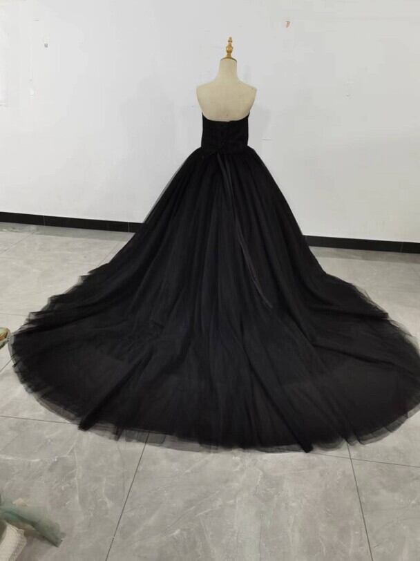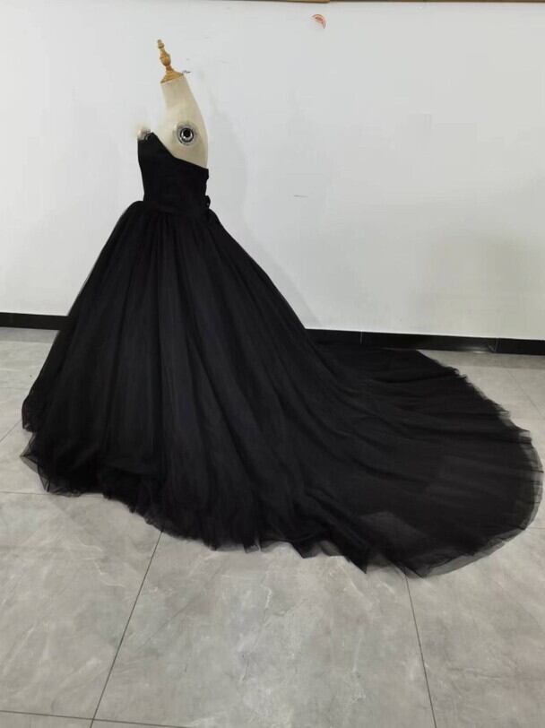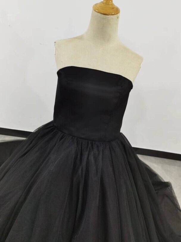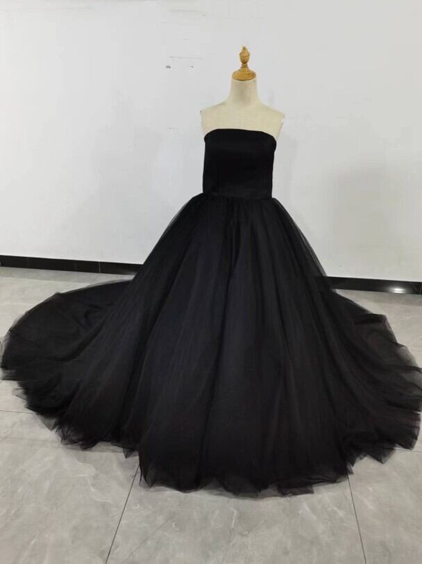 高品質! カラードレス 黑 オーガンジー ベアトップ トレーン 前撮り 2次会