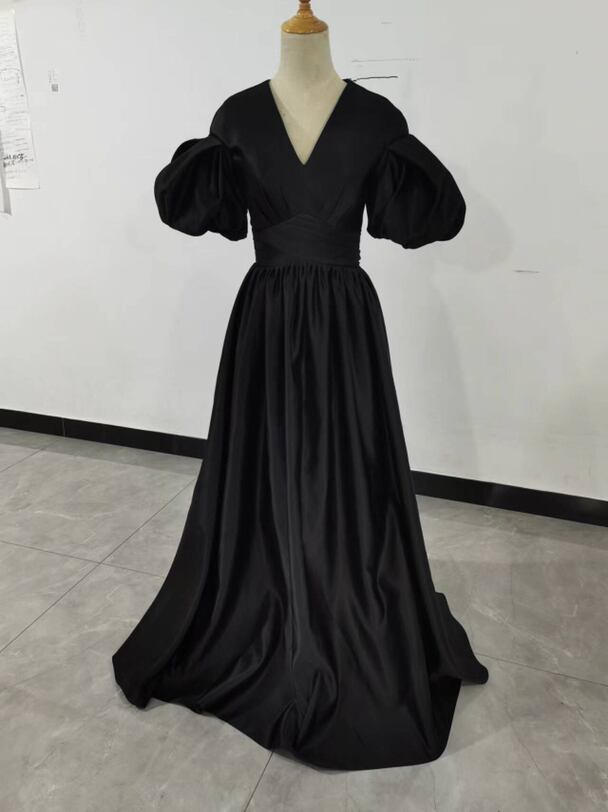 高品質タフタ ネイビー カラードレス Vネック 姫袖 音楽会/発表会
