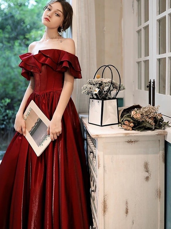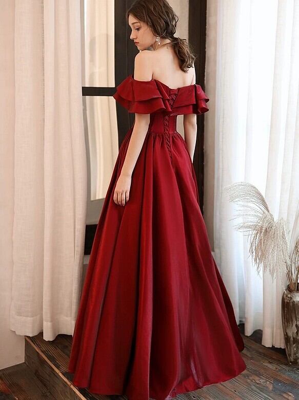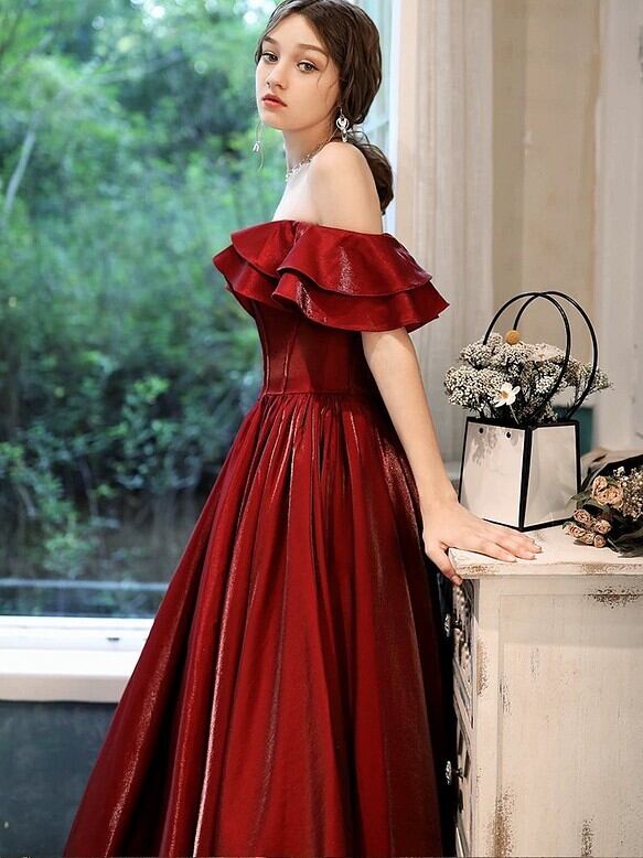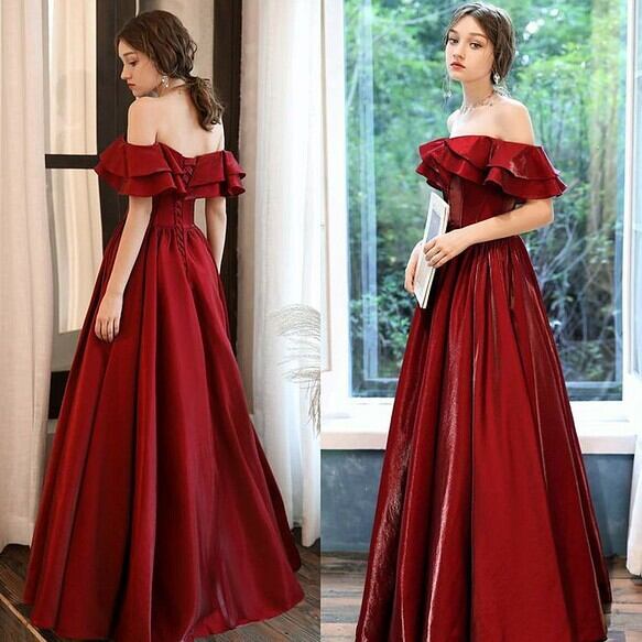 ワインカラードレス フリルオフショルダー 二次会 前撮り 後どり