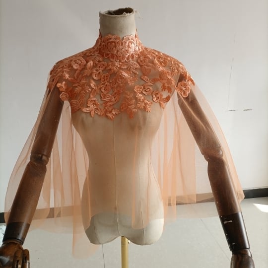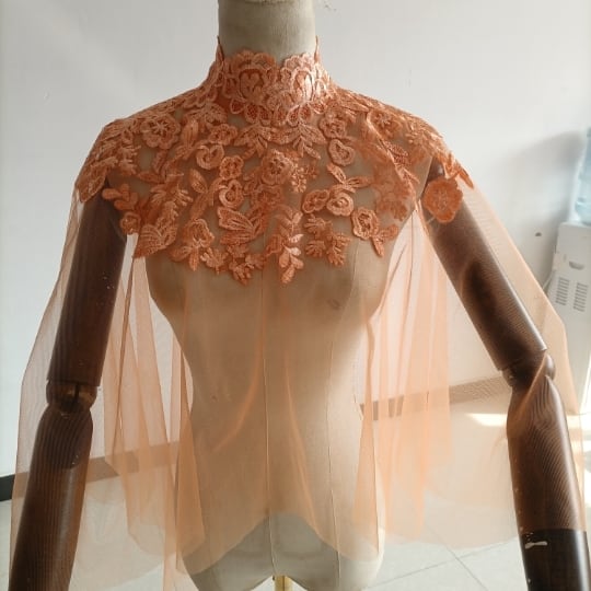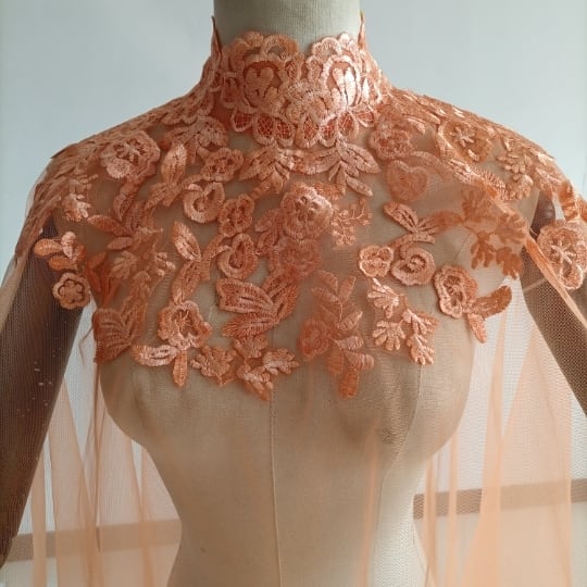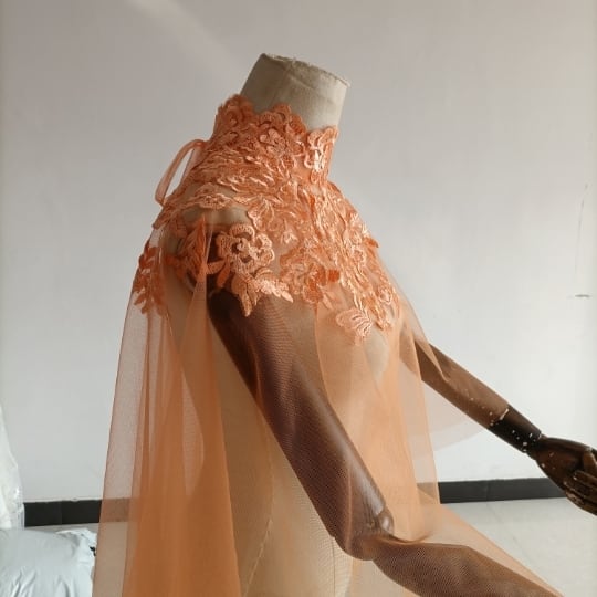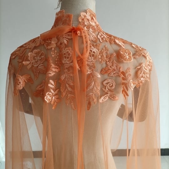 エレガント オレンジ トップス ケープ風ボレロ ウエディングドレス 咲き誇る透け花レース