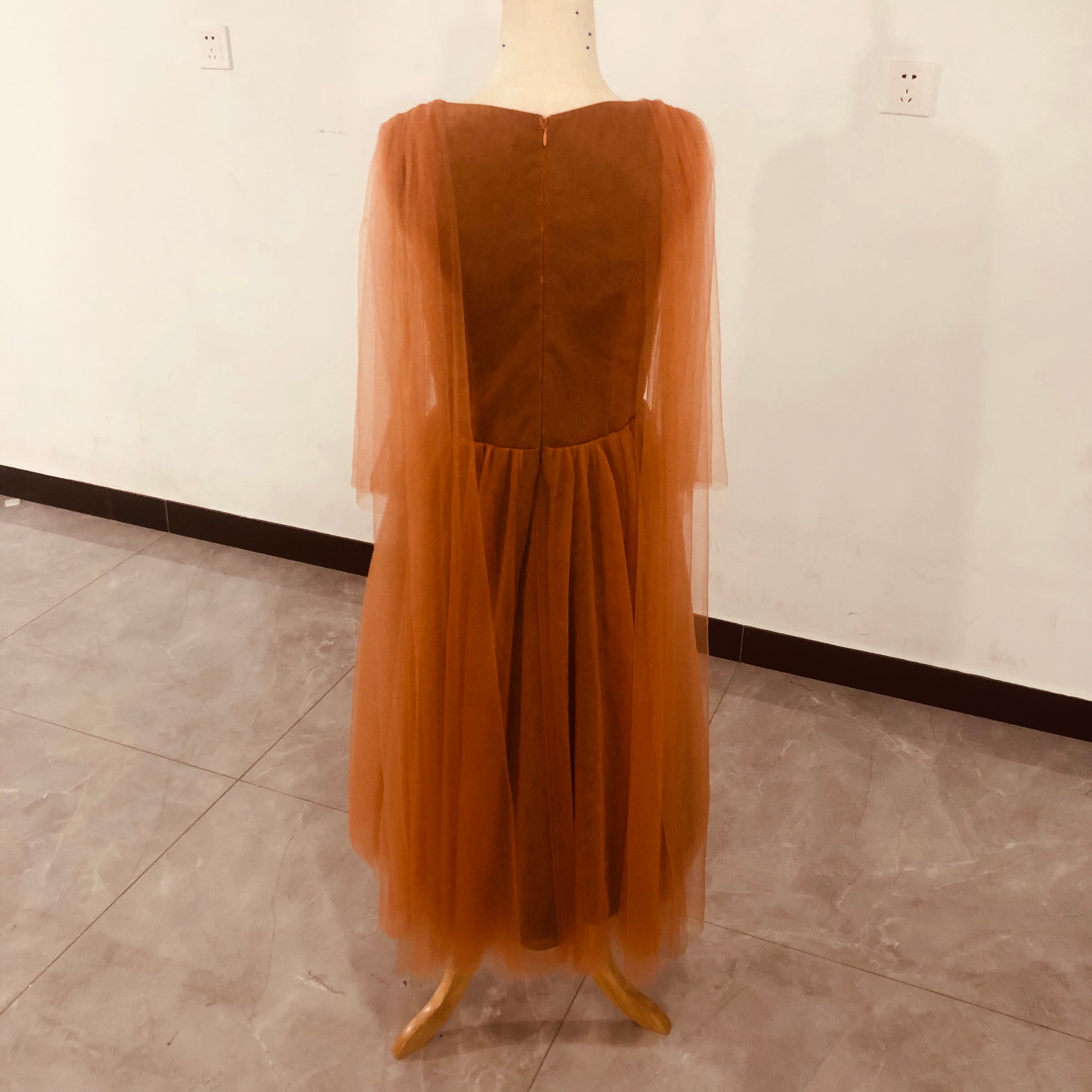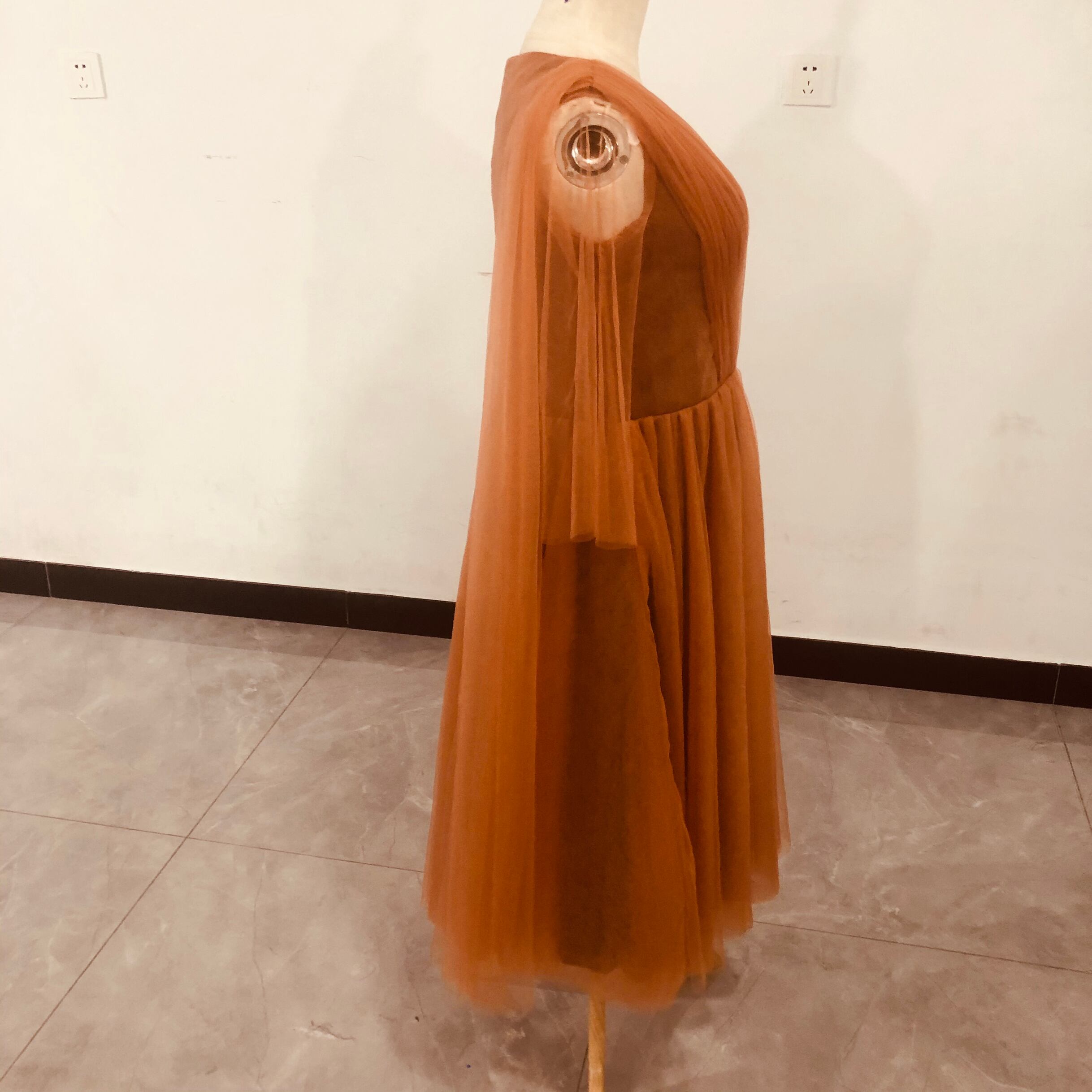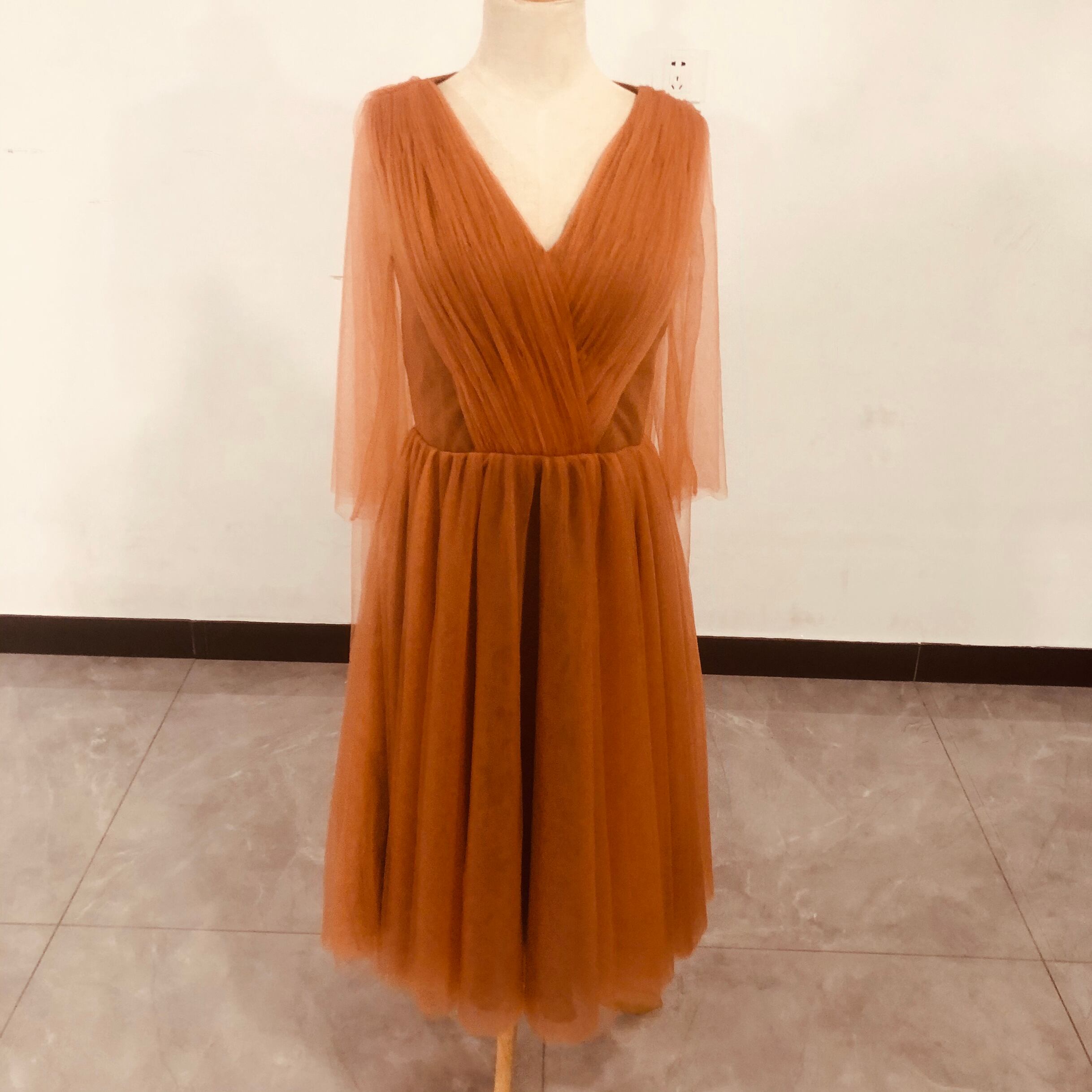送料無料!人気上昇!カラードレス テラコッタ色 Vネック ドレス ソフトチュ ふわふわ袖 ./2次会/挙式/前撮り