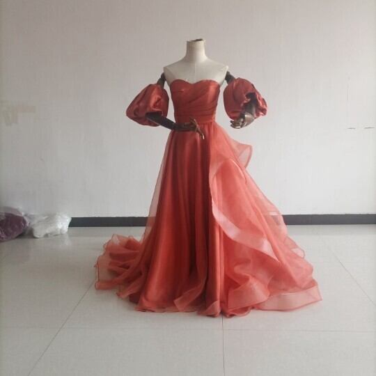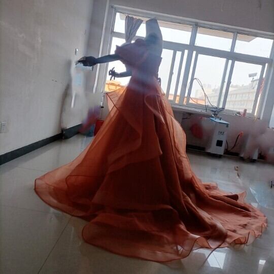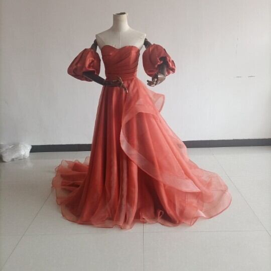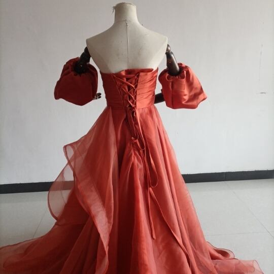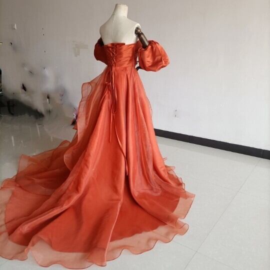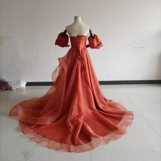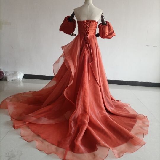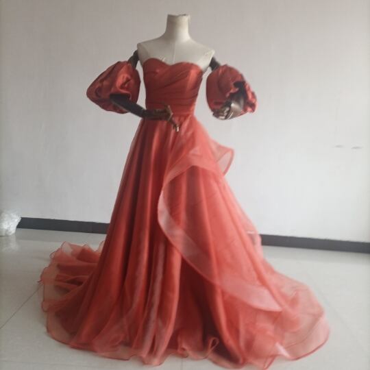 送料無料!人気上昇!パーティードレス テラコッタ色 テラコッタ ベアトップソフトチュール 華やかなトレーン/結婚式/披露