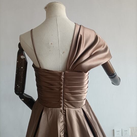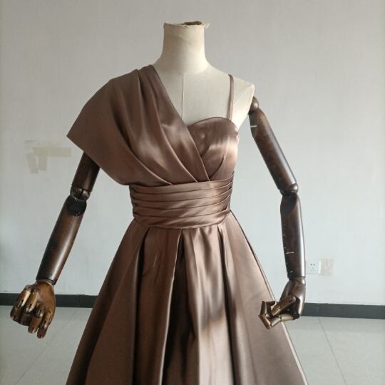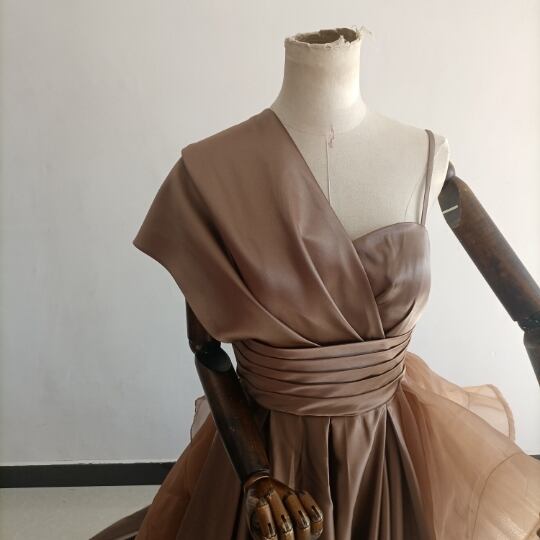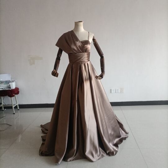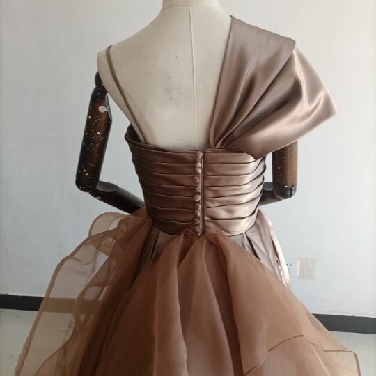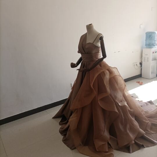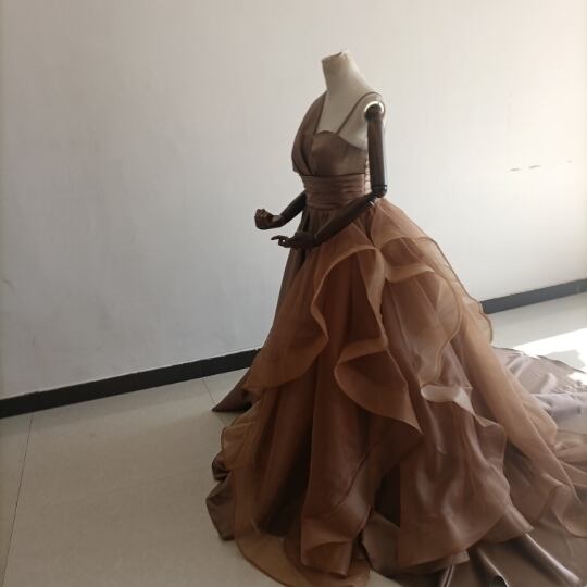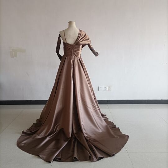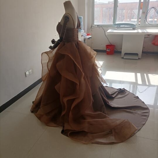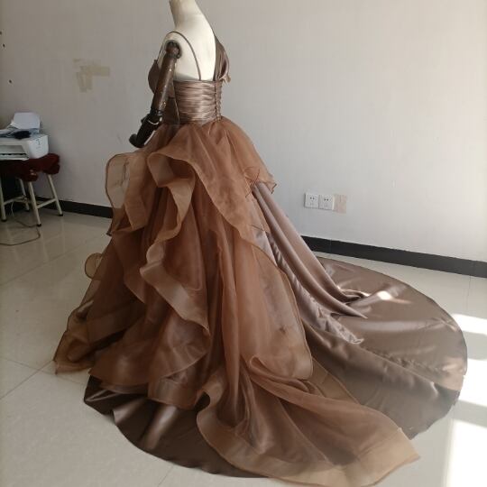 送料無料!人気上昇!パーティードレス 茶色 ブラウン ベアトップ 華やかなトレーンふっくら柔らかなバック/結婚式/披露宴