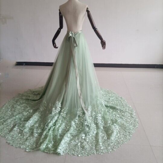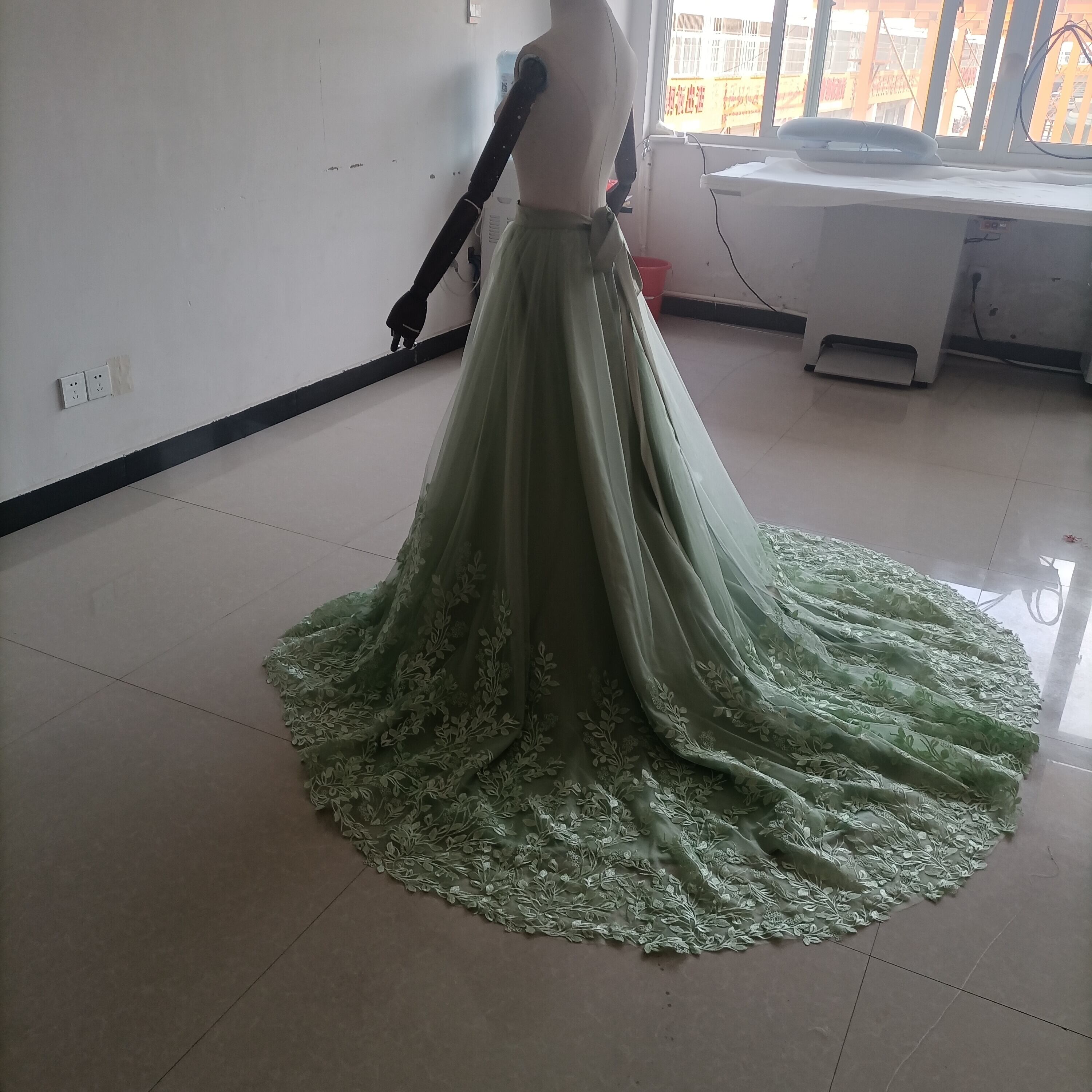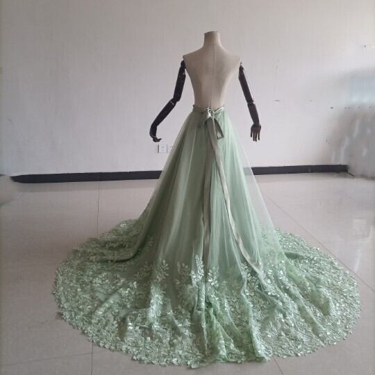 送料無料!大人気上昇チュールスカート 薄グレー リーフ刺繍 華やかなトレーン 花嫁/ウェディングドレス/オーバードレス