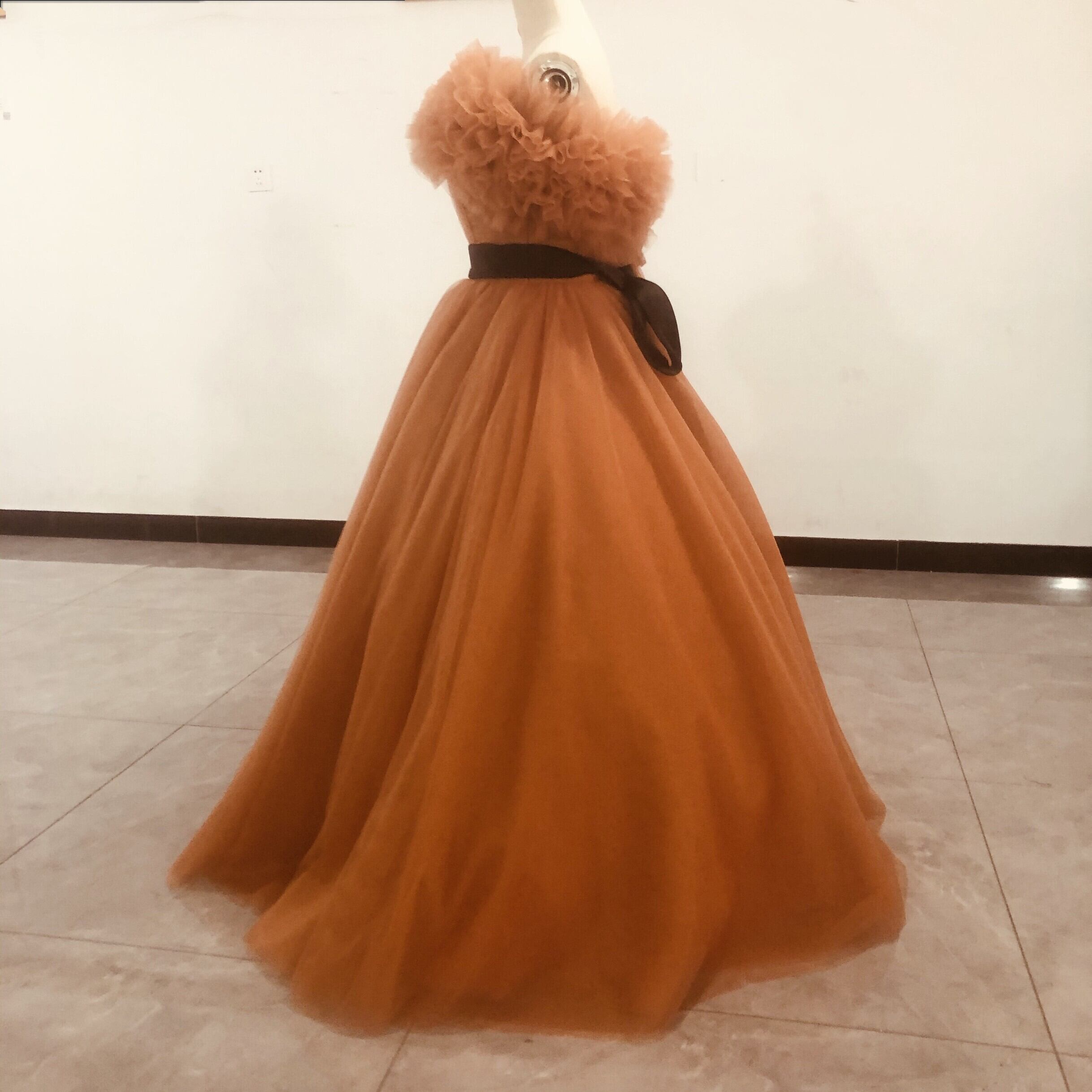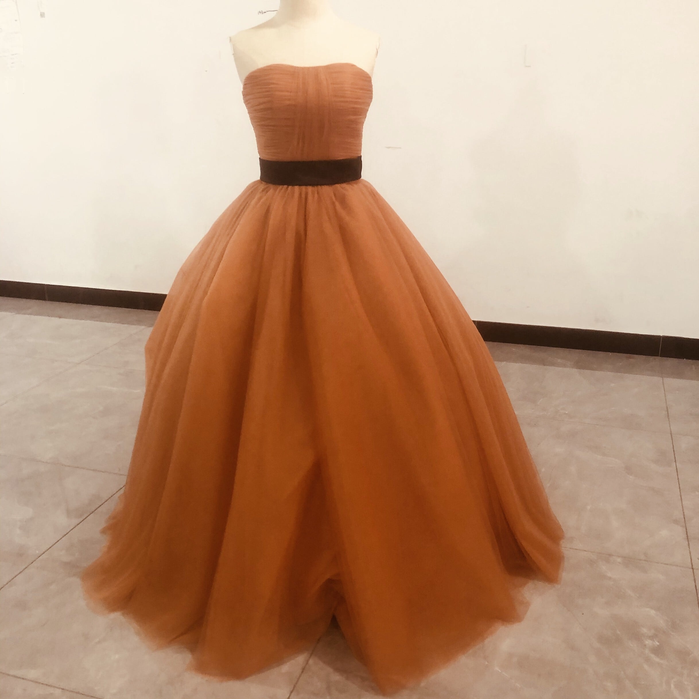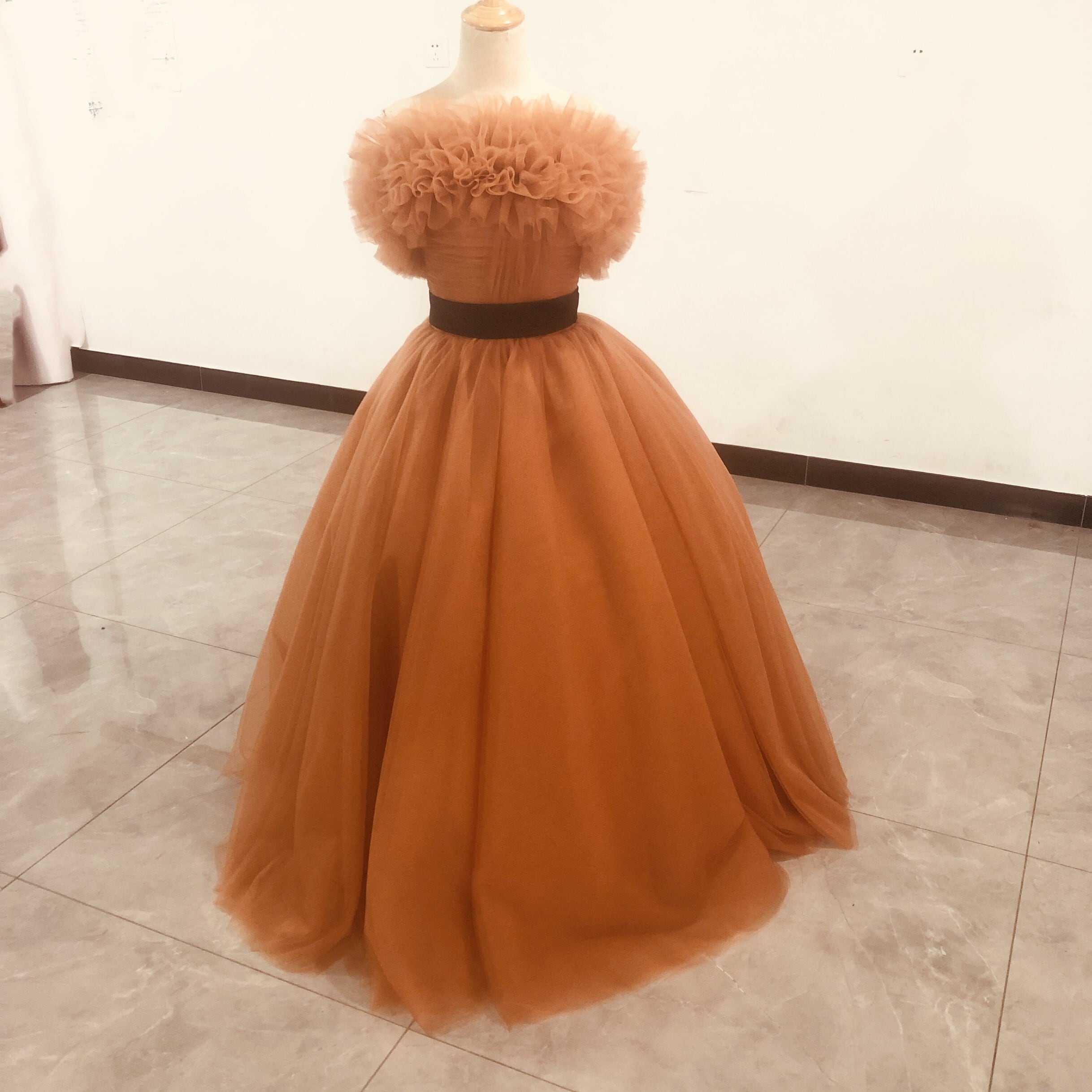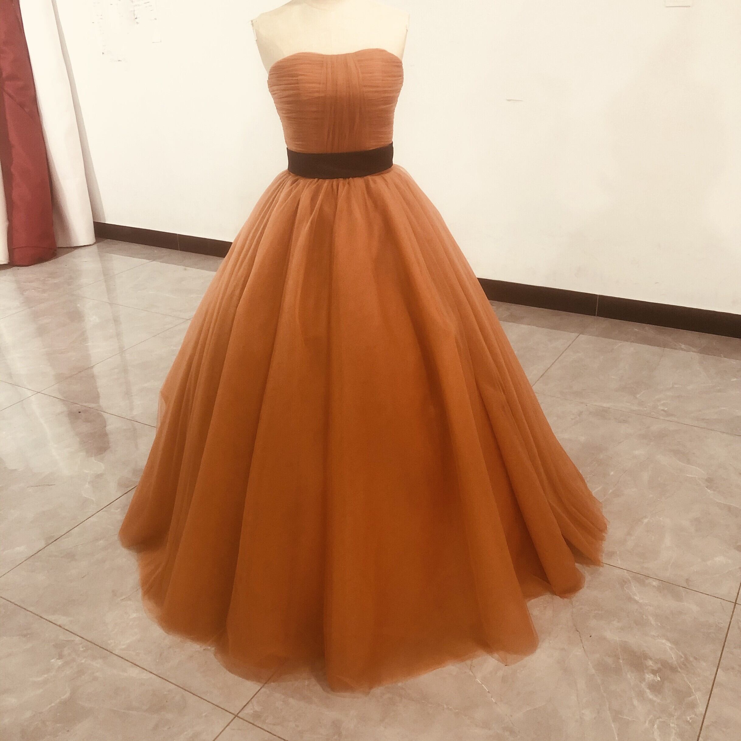 送料無料!高品質! パーティードレス テラコッタ色 トレーン ボリューミー取り外し可能オフショル 編み上げ カラードレス