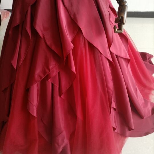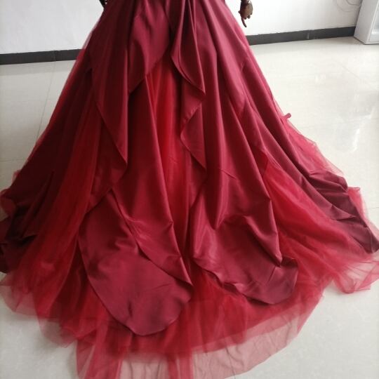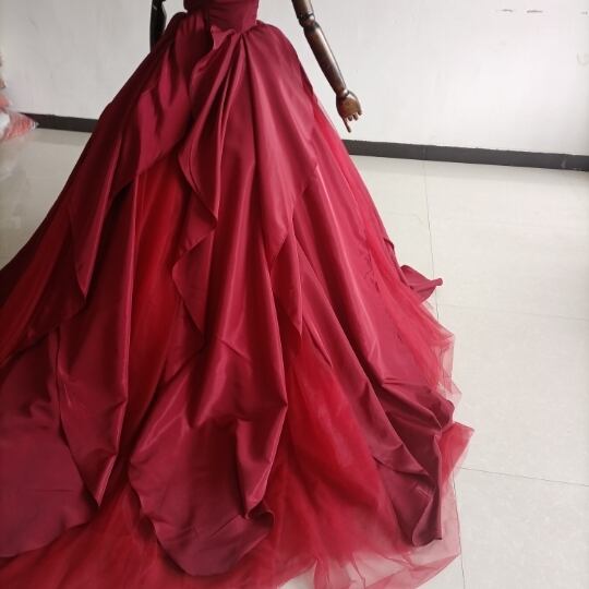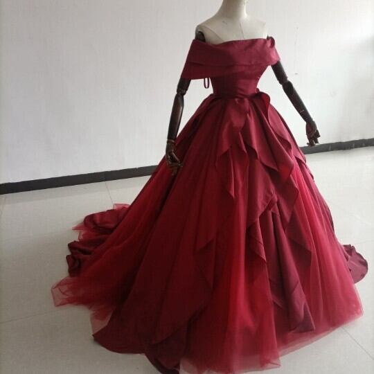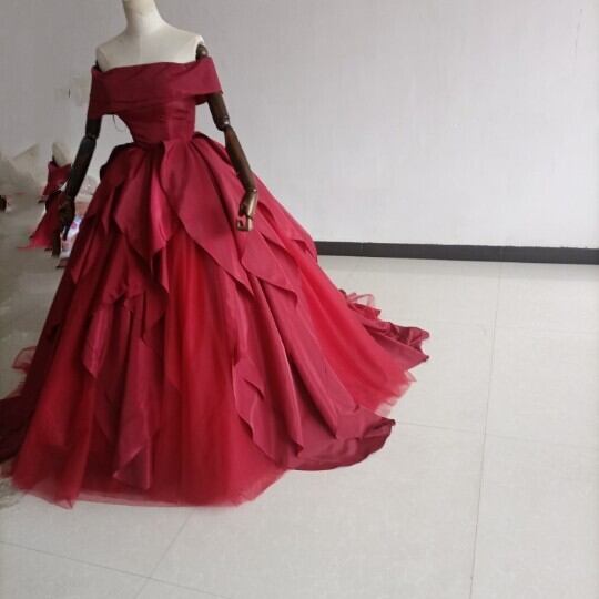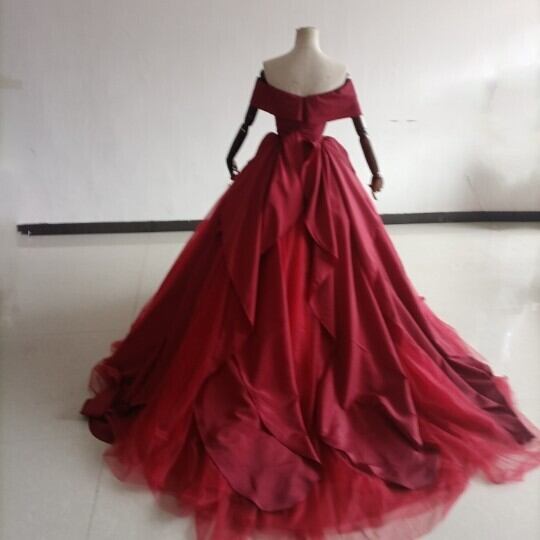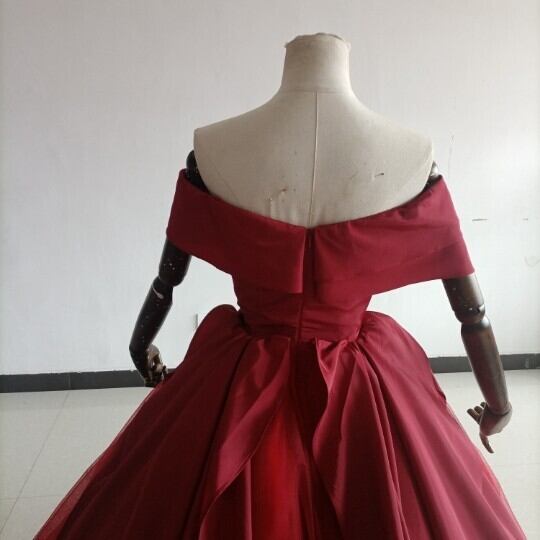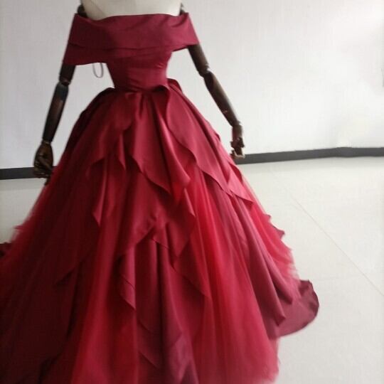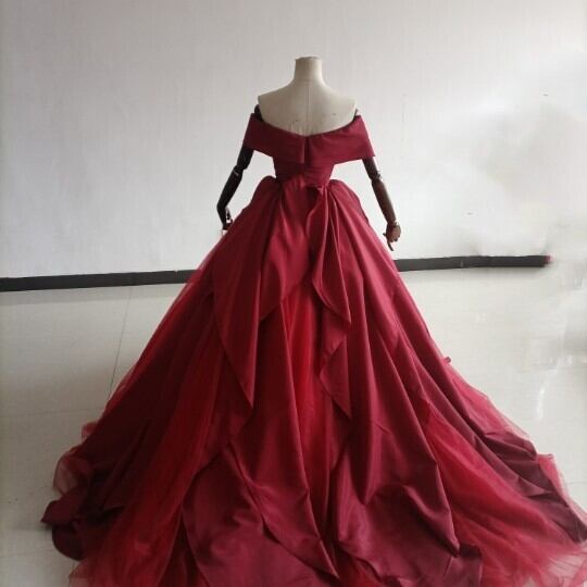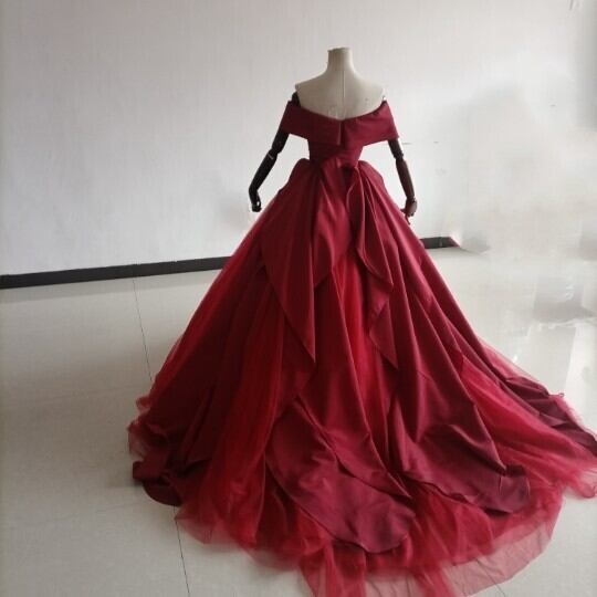 送料無料!人気上昇!カラードレス パーティードレス テラコッタ オフショルダー 華やかなトレーン/結婚式/披露宴