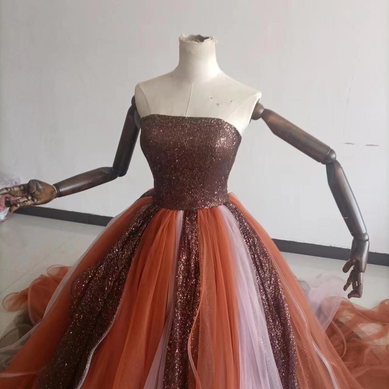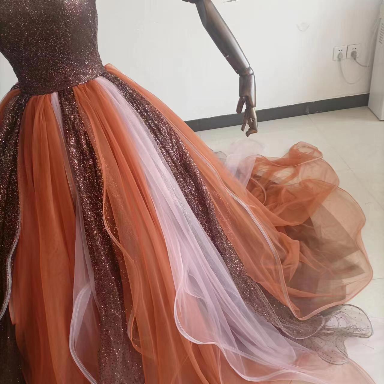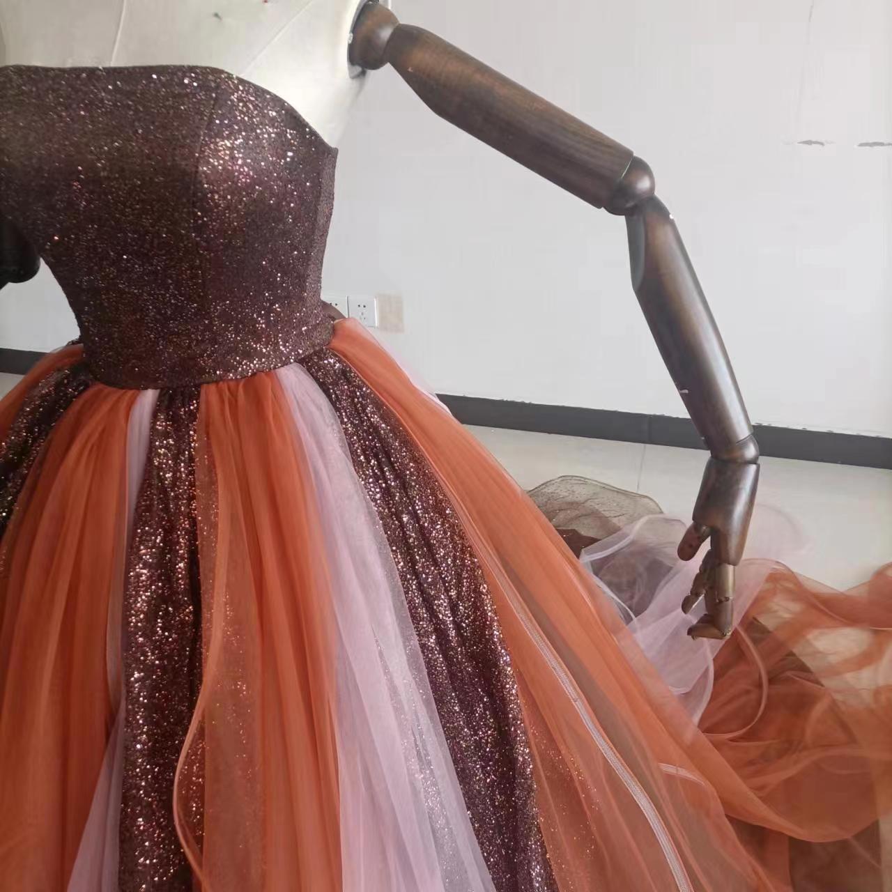 送料無料! ブラウン 茶色 輝きな光彩を放つ キラキラチュールカラードレス 可愛い 編み上げ プリンセスドレスオーバード