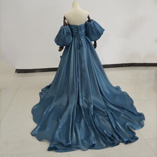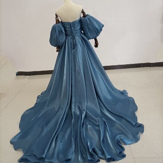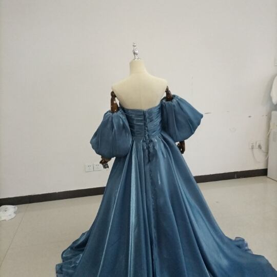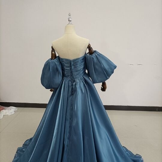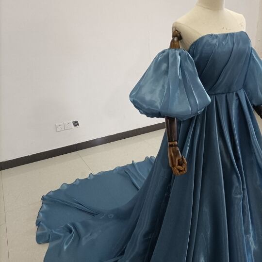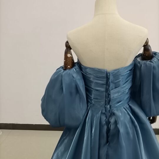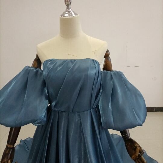 送料無料!人気上昇!ブルーグレーカラードレス パーティードレス ベアトップ 取り外し 姫袖 /結婚式/披露