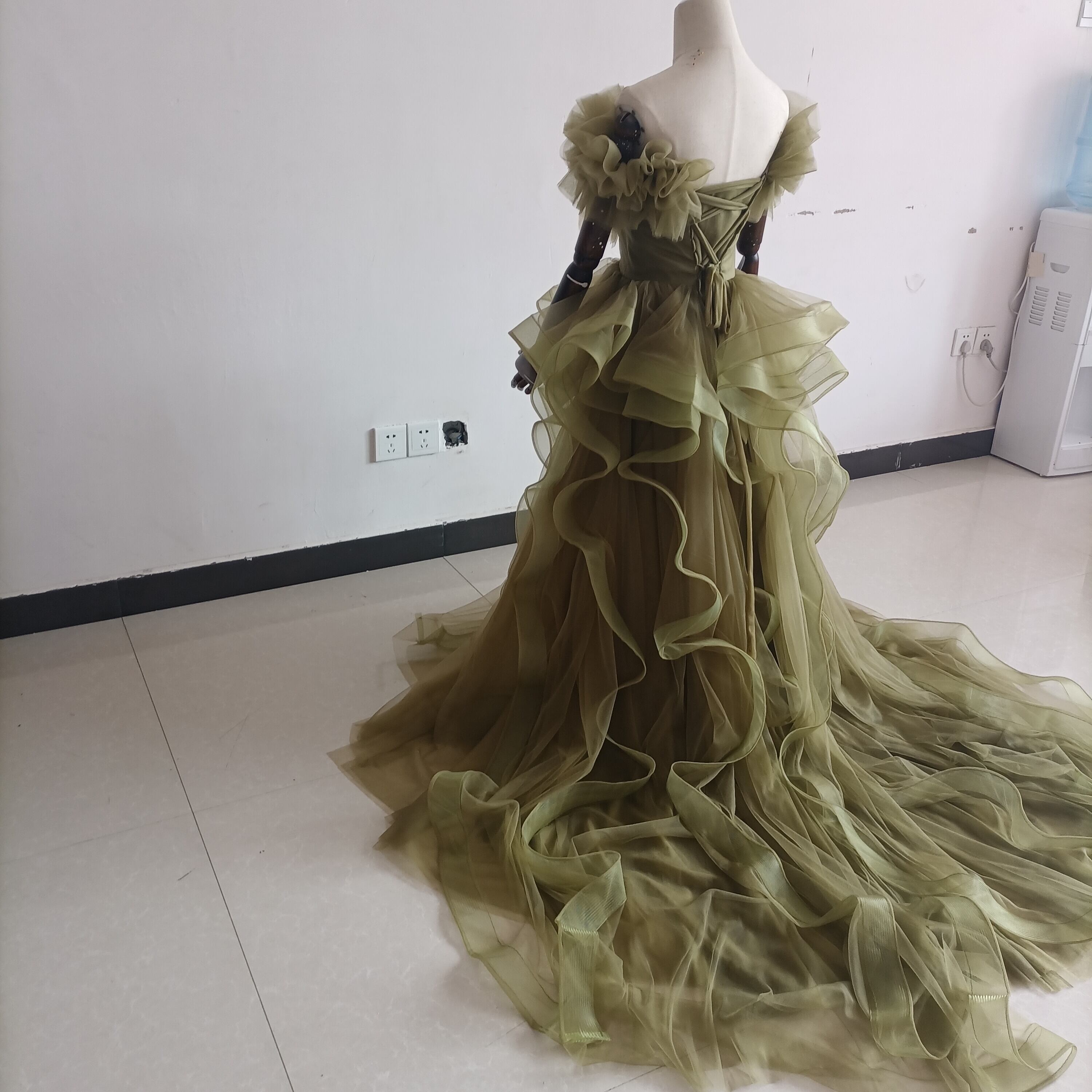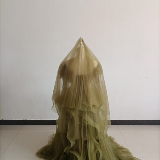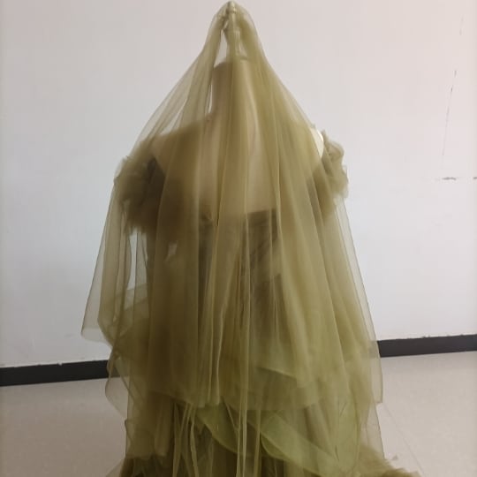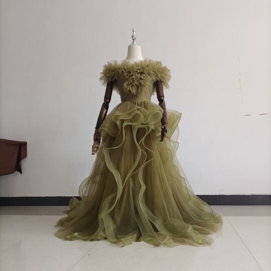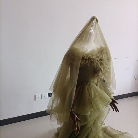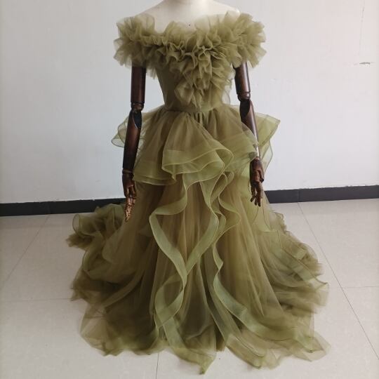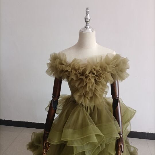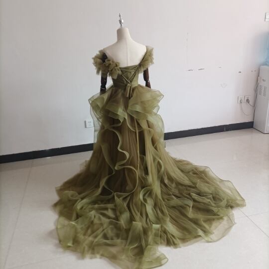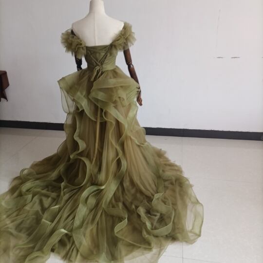 オリーブグリーン(カーキ)カラードレス ビスチェ 柔らかく重ねたチュールスカート+ミドルベール /結婚式/披露宴